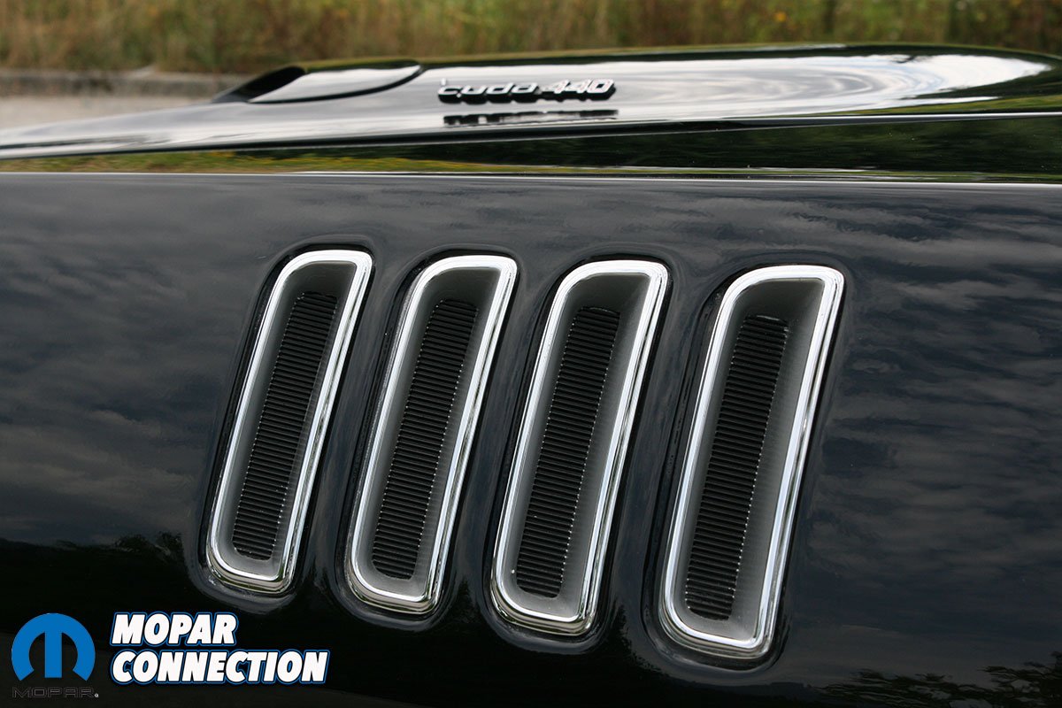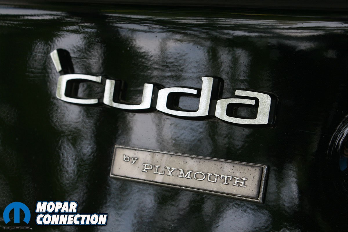 Reproduction 1971 quarter panels and a tail light panel were sourced from Auto Metal Direct along with the gilled 1971 only ‘Cuda fenders. He had always wanted a black ‘Cuda so he decided to change up the purple and go all black with it,” Jim shares.