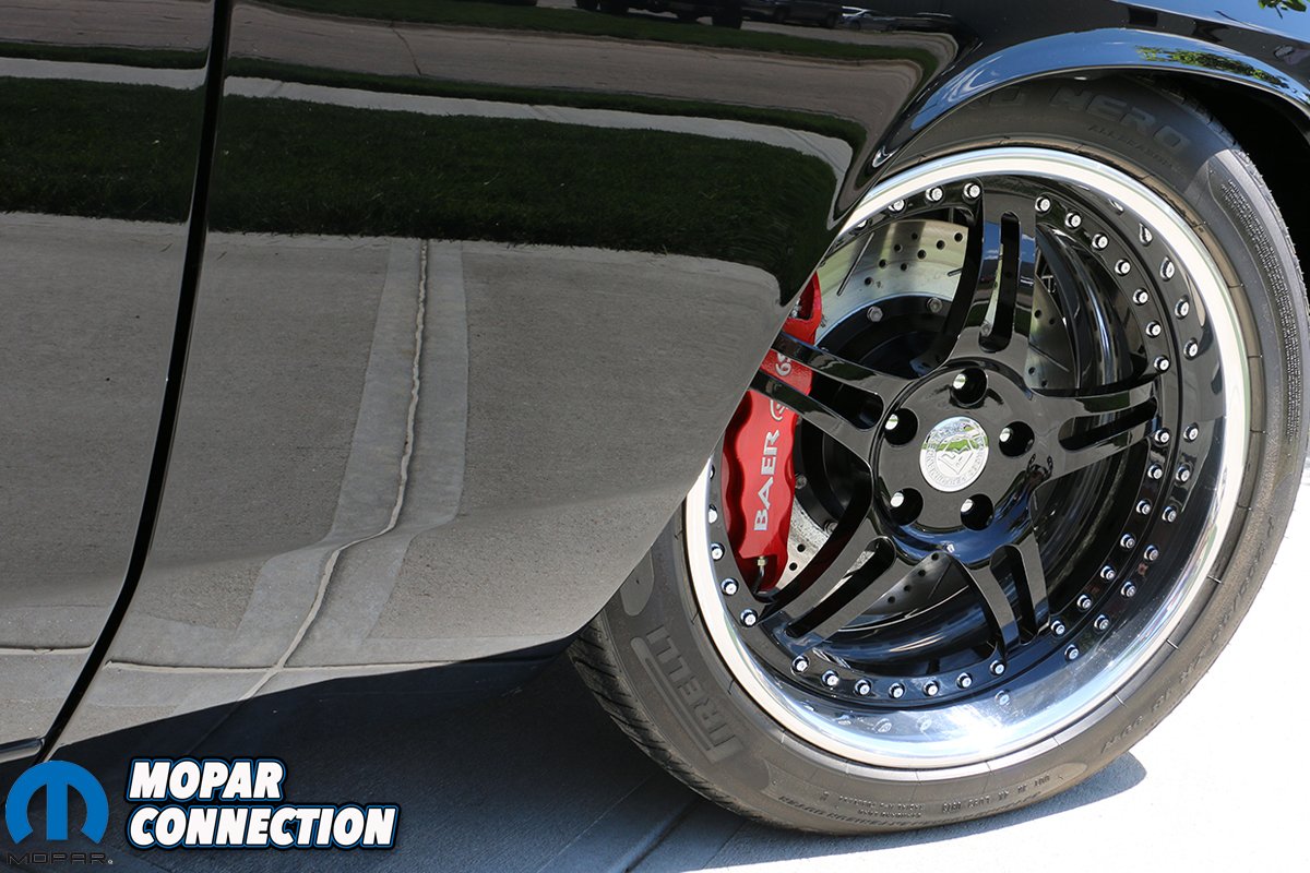 The front suspension was equally updated with a Magnum Force tubular K-member and engine cradle, heavy-duty sway bars, and all balanced on new QA1 adjustable coilover shocks at all four corners. The body rolls on massive 18×8 (front) and 20×16 (rear) one-off three-piece wheels doing little to hide the 6-piston Baer disc brakes clamping down on drilled and slotted 14- (front) and 15-inch (rear) rotors. The body too received a great deal of work, extending the rearmost lip of the decklid and quarters into a faux-Viper GTS spoiler, and a new vented and opened rear valance panel exposing the modern 3.73 rear.