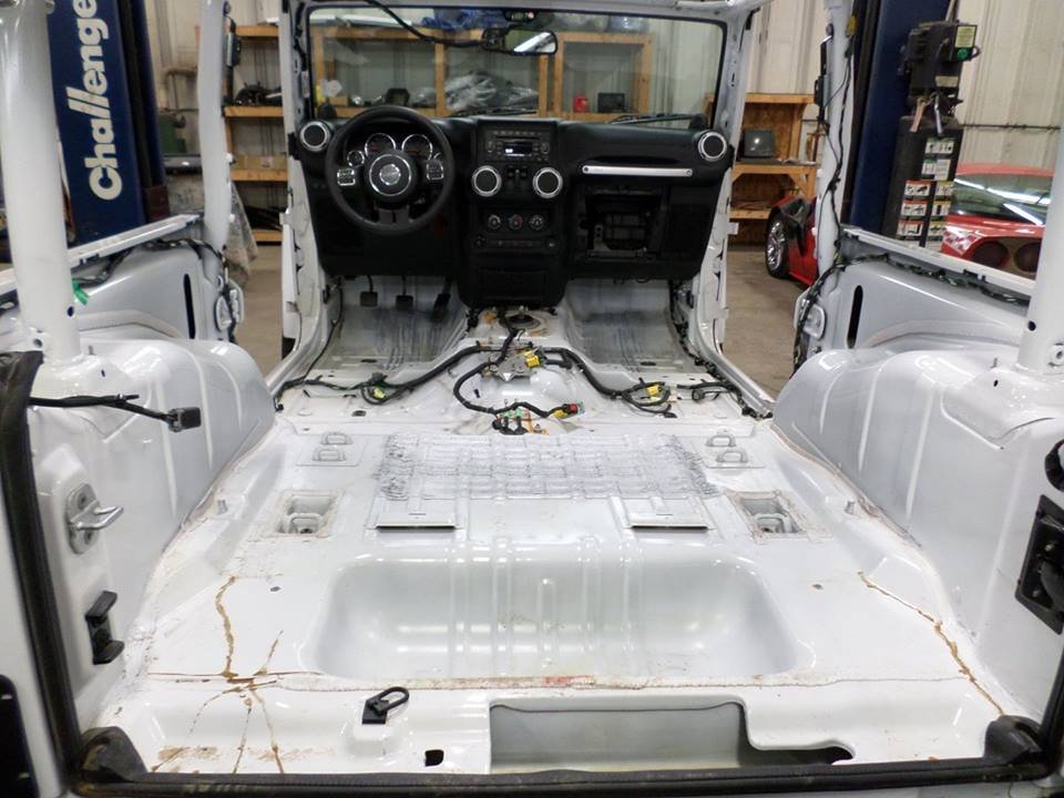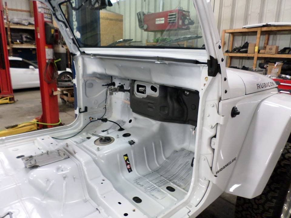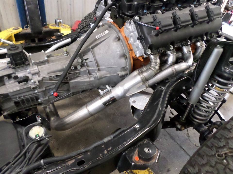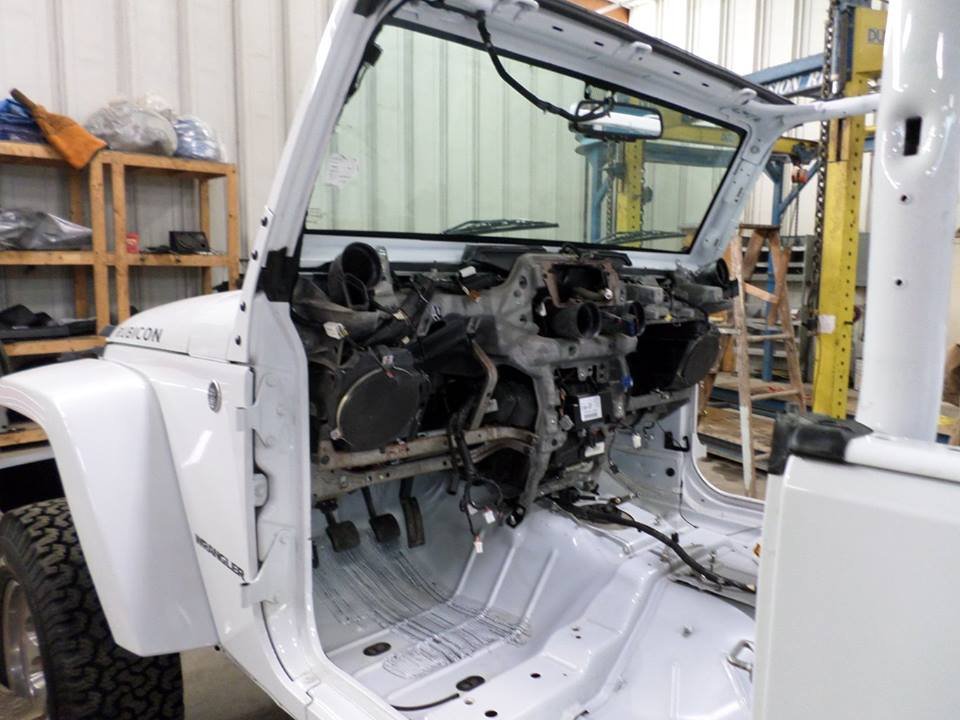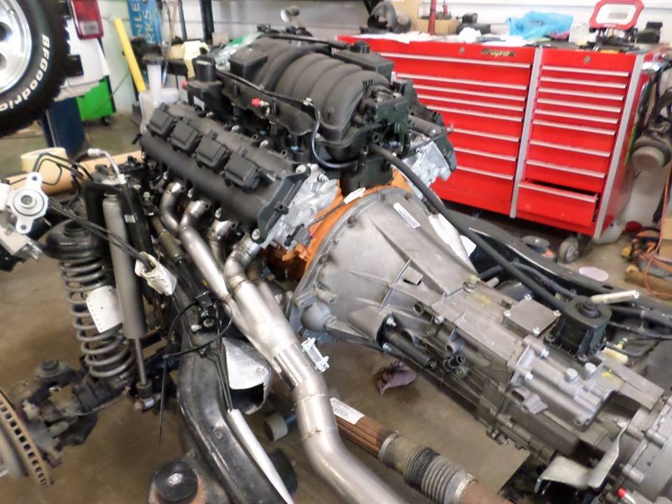 After all of the flood affected components were replaced with parts from a donor Wrangler, the team went right to work with switching the drive train. Using a 6.4L 392 Hemi SRT V8 from a 2013 Dodge Charger SRT-8, this Wrangler produces 470HP and 470ft-lbs of torque! Prior to installation in the Jeep, the engine was rebuilt in house by their certified engine builder before being mated to a Getrag 6-speed manual transmission.