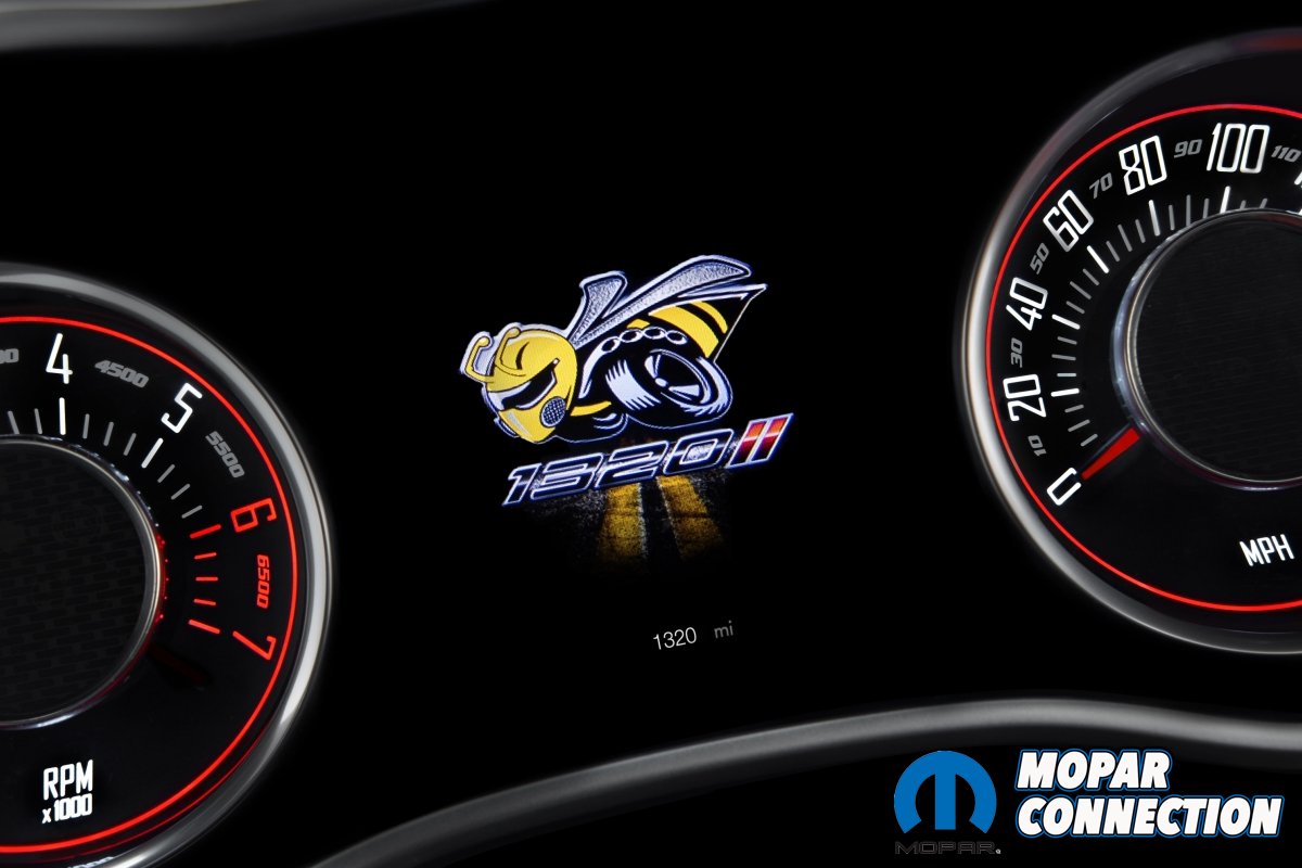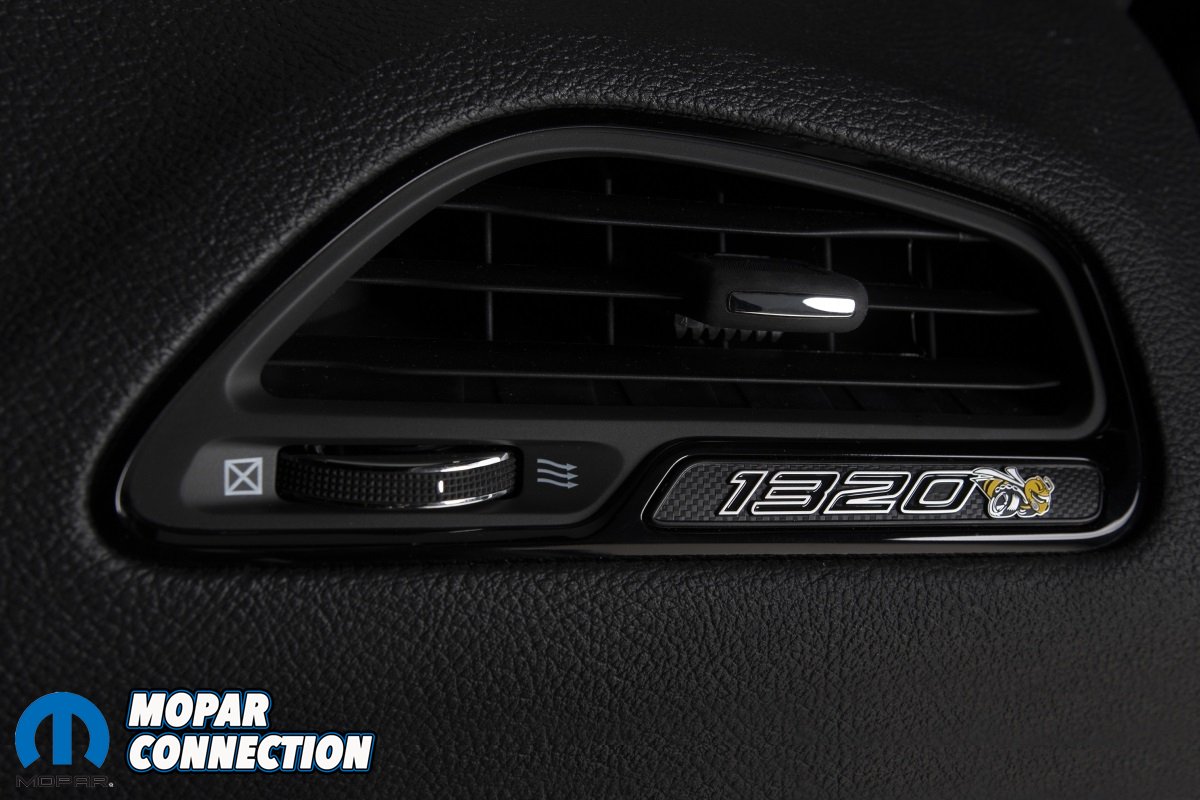 Also new and strictly for the 1320 is a new modern interpretation of the legendary Dodge Super Bee logo; the “Angry Bee,” marks the front fenders, illuminated Air Catcher headlamps, key-fob, passenger side dash vent, instrument panel and startup splash screen in the gauge cluster showing that this isn’t any regular Scat Pack. The 1320 comes with the 8.4-inch Uconnect touchscreen that enables the driver to engage Launch Control and Line Lock within the Performance Control app. It also lets the driver select modes, including Drag Mode and Adaptive Damping Suspension, while working with the steering-wheel-mounted shift paddles to activate the TransBrake.