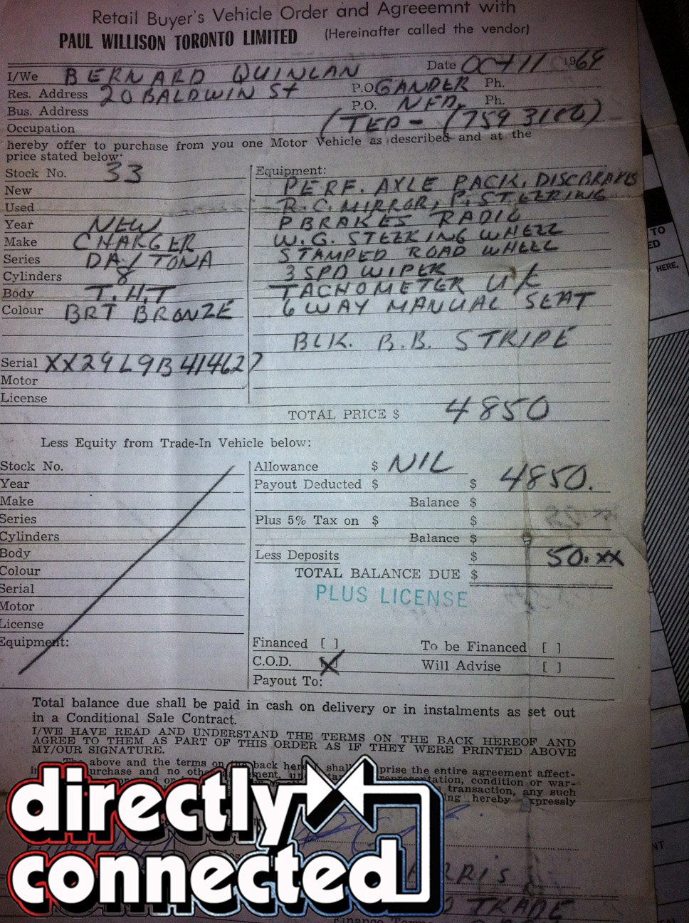 The only other Daytona that had come to Newfoundland was a 426 Hemi car, also an automatic. I knew who the original owner of that car was, so I thought he might know something about this particular Daytona. He did. In fact, he used to own it. He bought it new, in fact, a year before his Hemi car.
