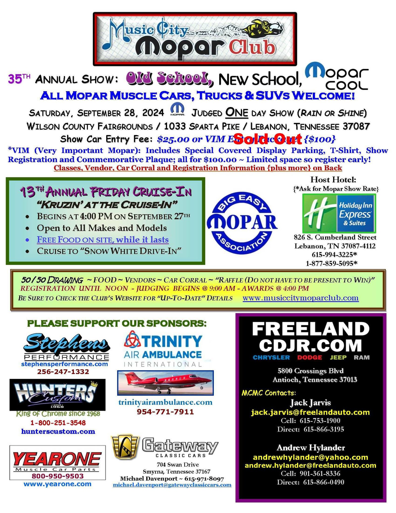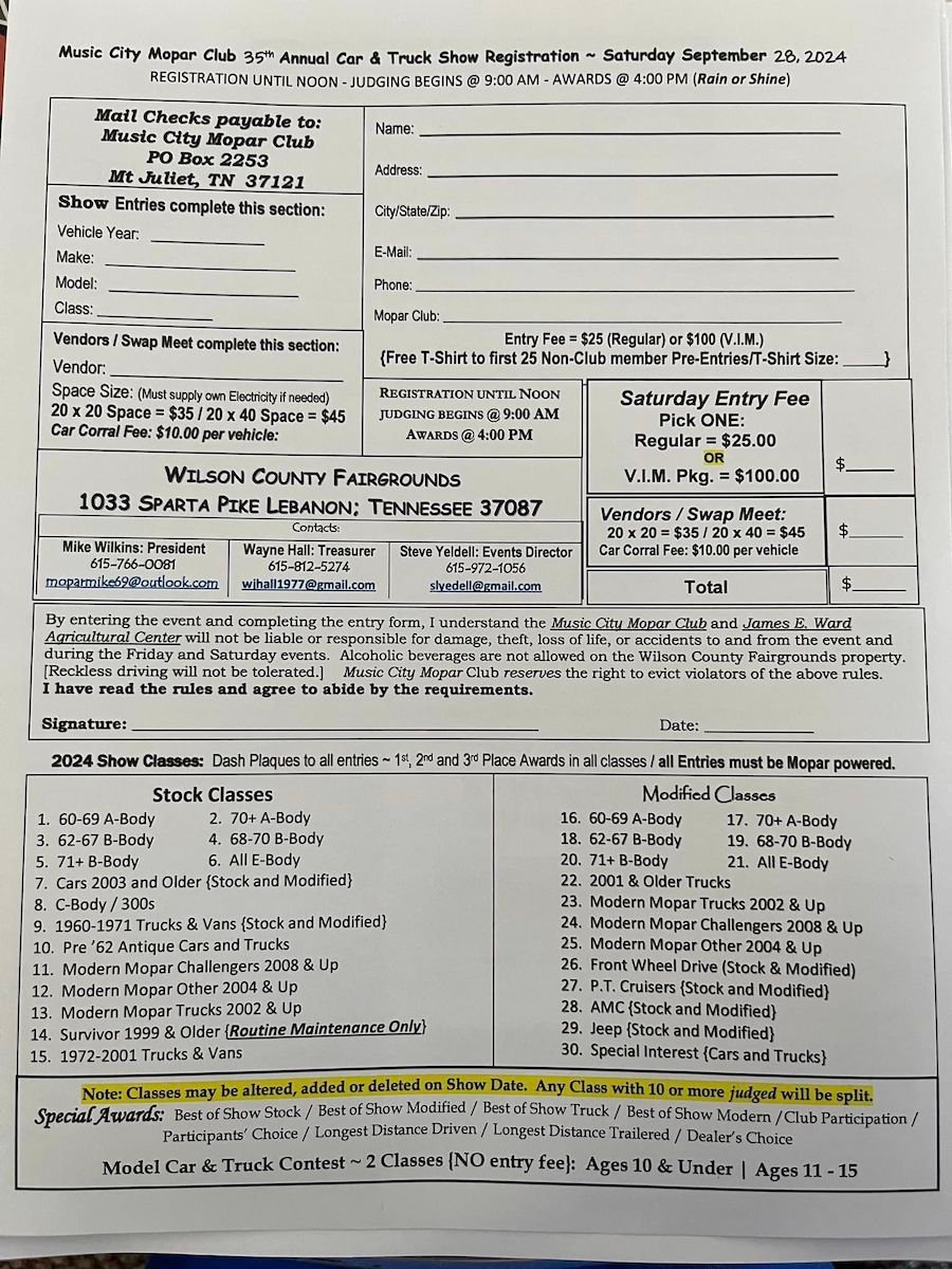 If you’d rather sell some wares, you can sign up for a swap meet space. And if you’re super old school and don’t trust them computer doohickeys, you can literally print out the registration form, fill it out with ink and quill, and submit it and your registration fee in person. Either way, you’re not gonna want to miss it; the Music City Mopar Club works super hard to put on a great end-of-the-season event that all will enjoy.