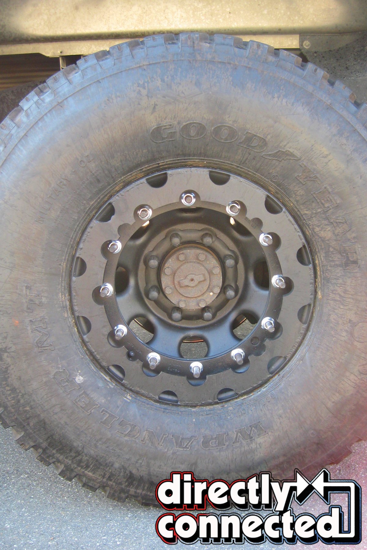 Above left: Here you can see the difference in size between the old Toyo 35” tire and the new Military 37”. Above right: Our set of wheels came with 12 bolts holding the two-piece wheel together. (Both lighter duty and 24-bolt super heavy duty versions are also available.)