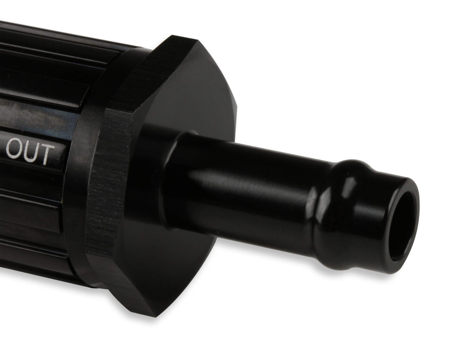 The filter housing and filter elements can operate a fuel pressures up to 100 psi. Regardless of which bronze filter is selected, it is retained in a billet aluminum body that has a black anodized finish and laser etching designations of the in/out fuel direction. The filter element is easily installed by unthreading one end cover of the filter housing, dropping in the element, and rethreading the filter cover. The body measures 4.5-inches in length and is 1-inch in diameter, so its compact size should minimize installation concerns.