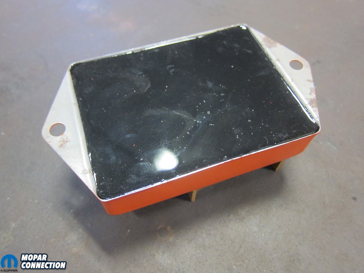 Top: Our old dual-points distributor vs. our new Proform Mopar electronic distributor. Bottom Left: The ECU was also fully potted on the back side to protect internal components. Flanges are unpainted for grounding purposes. Bottom Right: A ballast resistor was included (right) and looked very similar to the old one. The new piece was fully potted for a long service life.