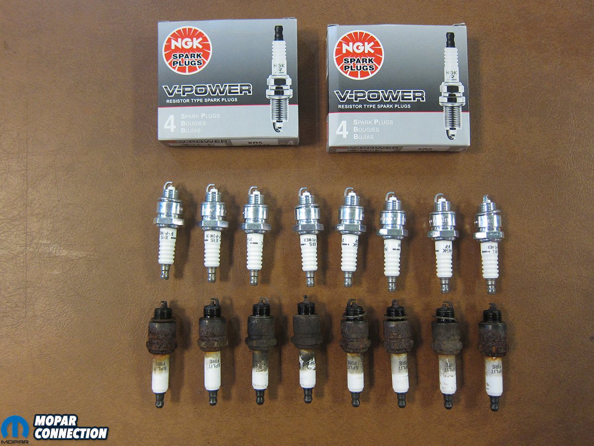 Top Left: Reluctor to pickup gap was verified with a set of brass feeler gauges. Top Right: We gave the O-ring a light oiling so it could slide easily into the block. Bottom Left: Remember which way the old distributor’s rotor was pointing? The new distributor was installed so the rotor location was the same. A gentle push seated it all the way down to the block. Bottom Right: The instructions recommended new spark plugs, so we picked some up at the local parts store. The vintage Split Fire plugs (circa 1990) were shot.
