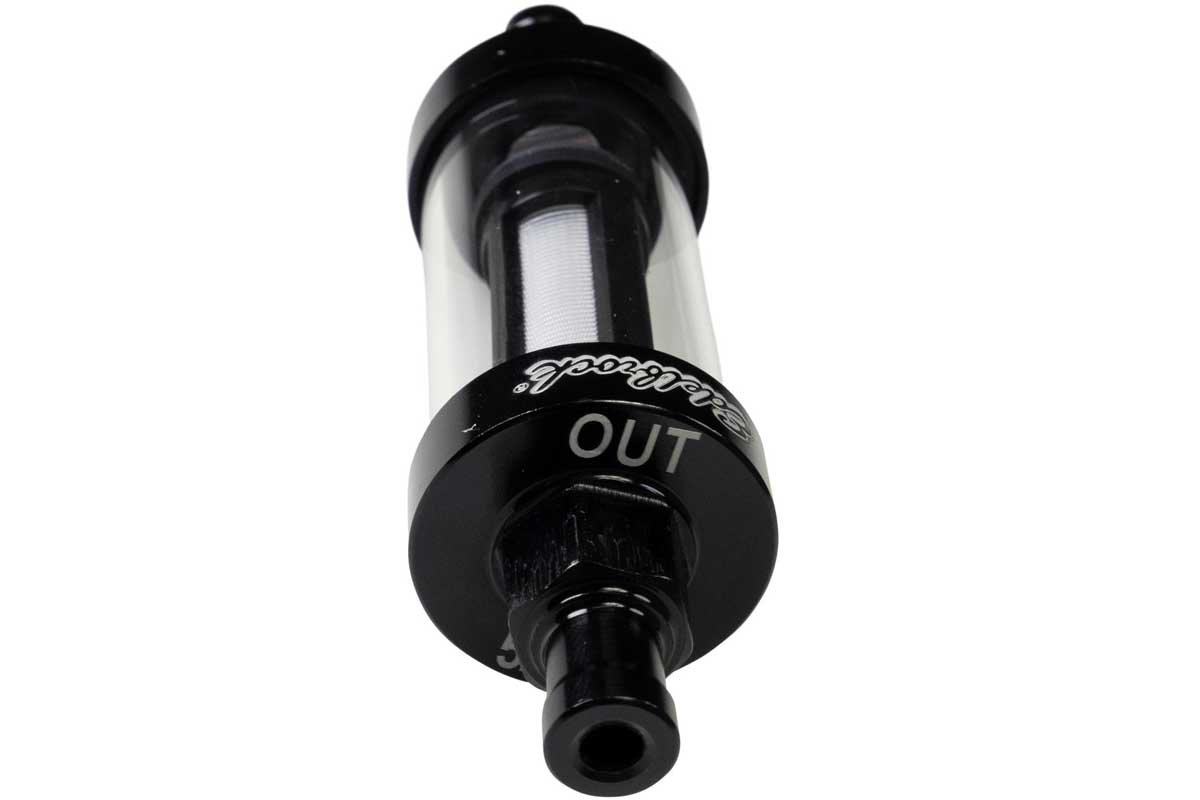 The fuel filter is located in the fuel line between the mechanical fuel pump and the carburetor. On one end of the filter is an aluminum barbed black E-coated fitting that is laser inscribed with the Edelbrock name. Each filter end fitting comes labeled with an in or out designation to determine filter orientation during installation. Each fuel filter is rated to operate with rubber hoses up to 10-psig.
