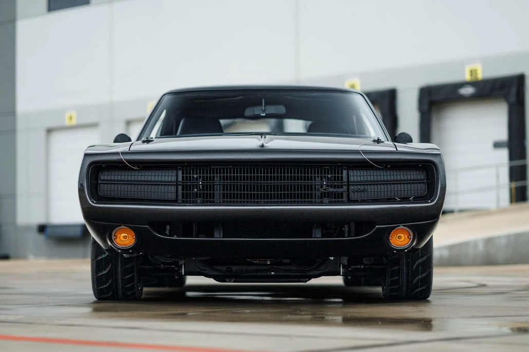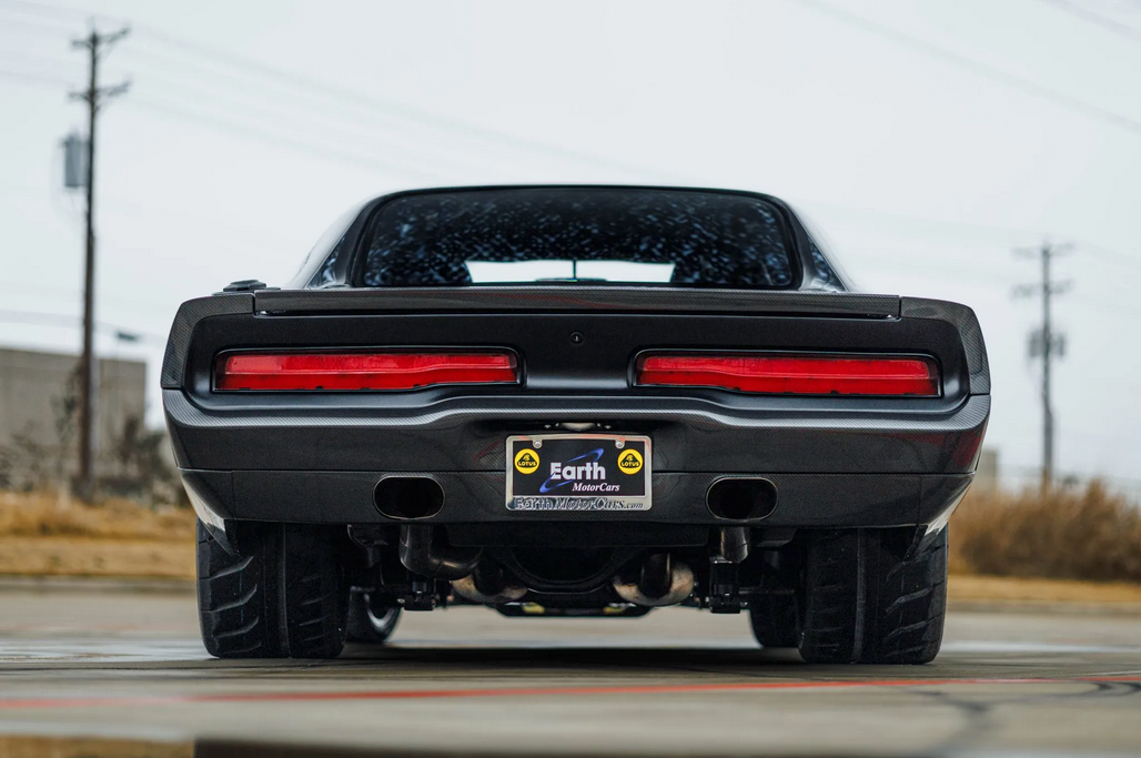 The Charger sits on a Salvaggio Auto Design perimeter chassis riding on power-assisted Wilwood cross-drilled and slotted disc brakes, JRI adjustable coil-over shocks, a Detroit Speed & Engineering Quadralink rear suspension, power-assisted rack and pinion steering, staggered-width multipiece 18” three-piece American Racing wheels measuring 18×8.5” up front and 18×12” at the rear with bronze-finished centers and black rims and wear three-eared spinners. Toyo Proxes R888 tires measure 245/40ZR18 front and 335/30ZR18 rear.