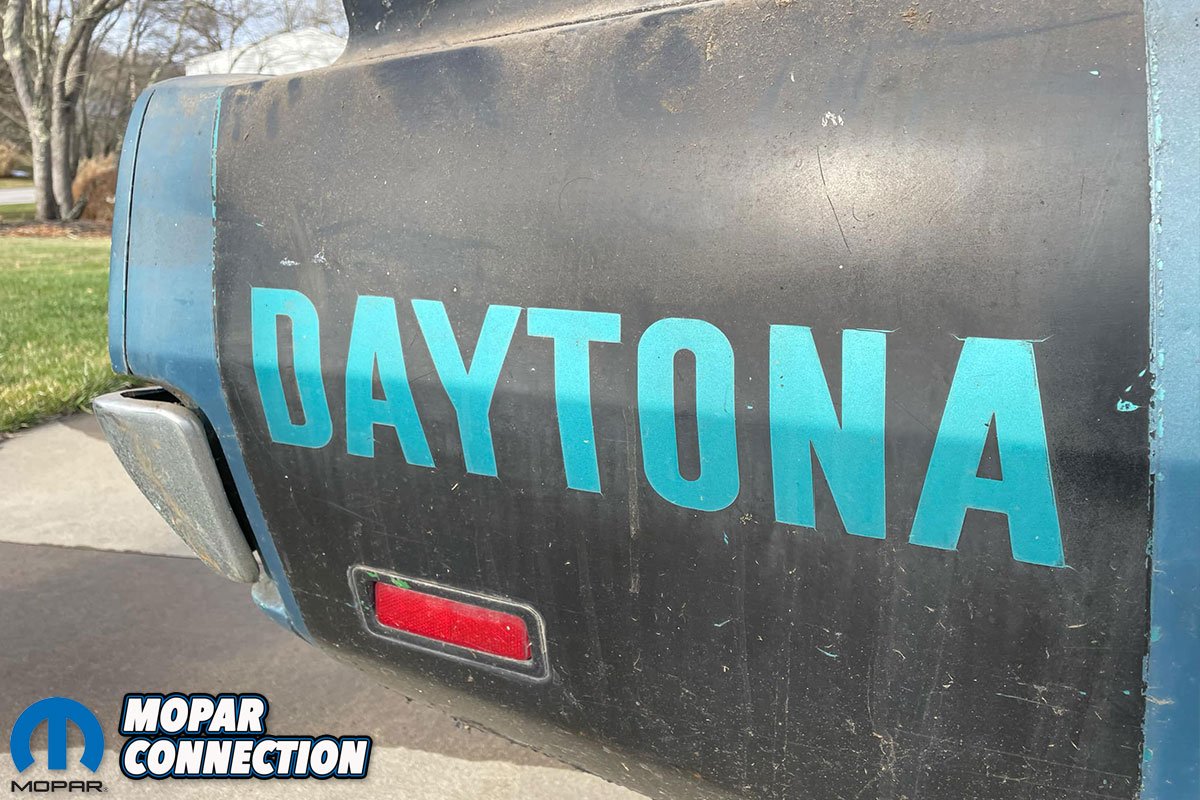 Over the first 15 years of its life, the Daytona lived a very hard 22,000 miles. The paint was falling off on the nose cone so Sam Kaminsky had the car painted by Earl Shibe. The repaint didn’t match but the original Q5 color still remains in the door jambs, headlight bezels and under the hood and trunk lid.