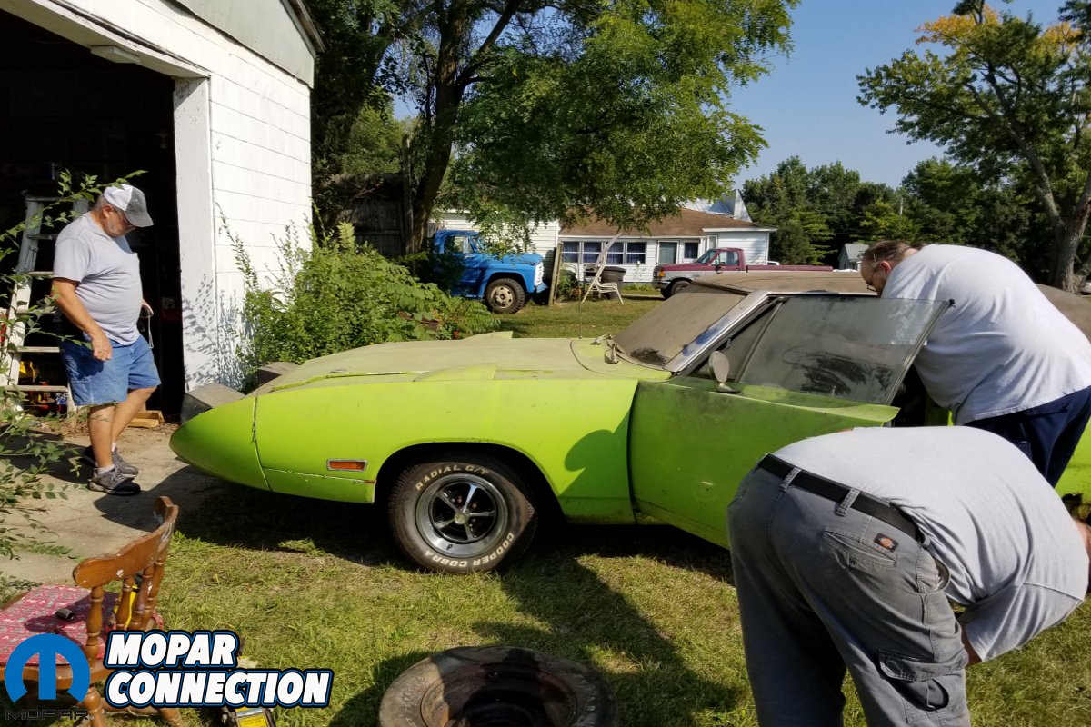 In mid-July 2017, Bob was contacted by a fellow named Charlie regarding a FJ5 Limelight Green 1970 Plymouth Superbird his wife’s uncle Randy owned in Elkhart, Indiana. See, Charlie worked with a fellow named Dave whose son Matt worked with Bob and had heard Bob was into wing cars. You with us still? Upon speaking to Charlie on the phone, Bob was told that the Superbird in particular had been bought brand new by Randy. Charlie told Bob that the car had been parked since the mid-1970’s in a garage and was Limelight Green with a 440 4-barrel and 4-speed with a bench seat. Not much else was known about the car. Charlie sent Bob five poor quality pictures showing a lot of dirt, some quarter panel rust and a flat tire; descriptive right? Bob’s attention was quickly caught when Charlie mentioned Randy wanted to sell the car.