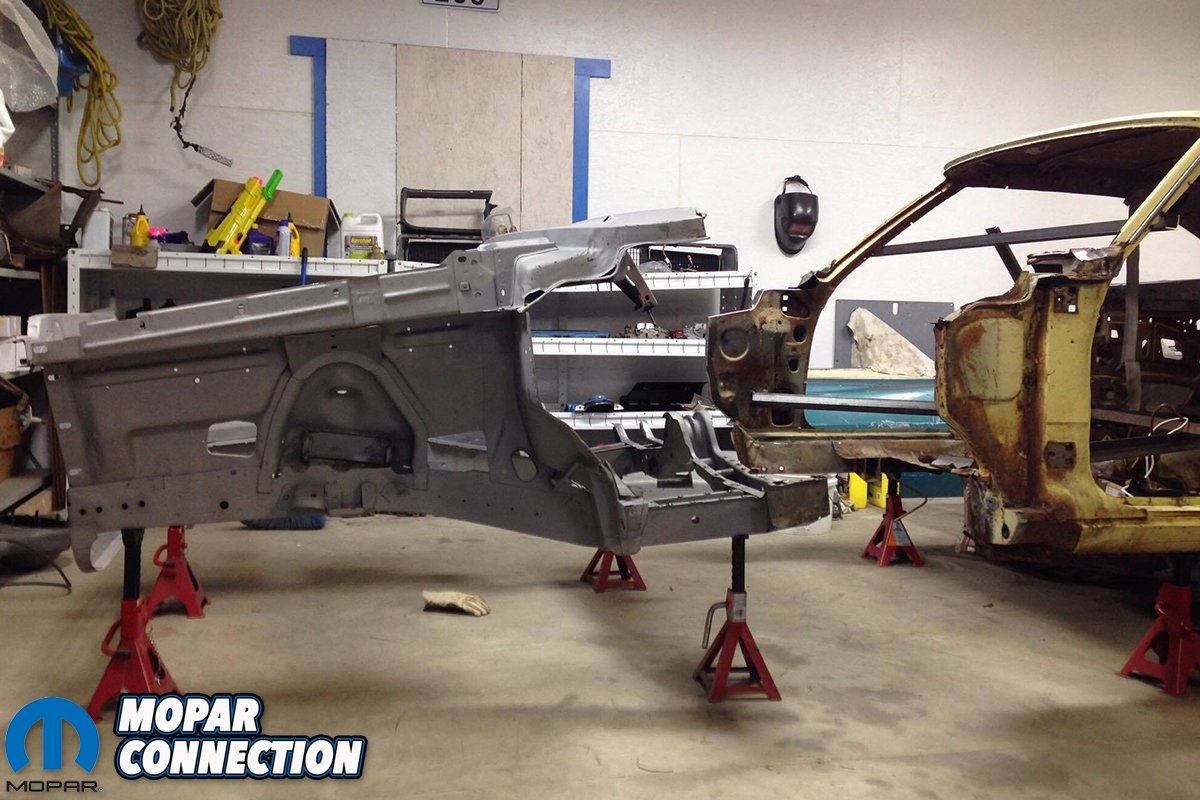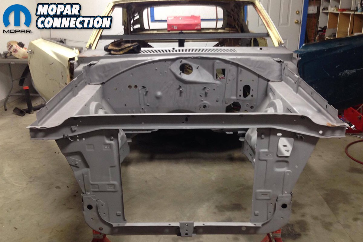Above left: A welder by trade, Forrest took no time chopping out the crunched and mangled front end. Above center: Having an entire front clip off a 1969 Coronet, Forrest trimmed what was needed to prepare for the install. Above right: After Forrest got the front clip blasted and primed, it was installed. Looking better already!