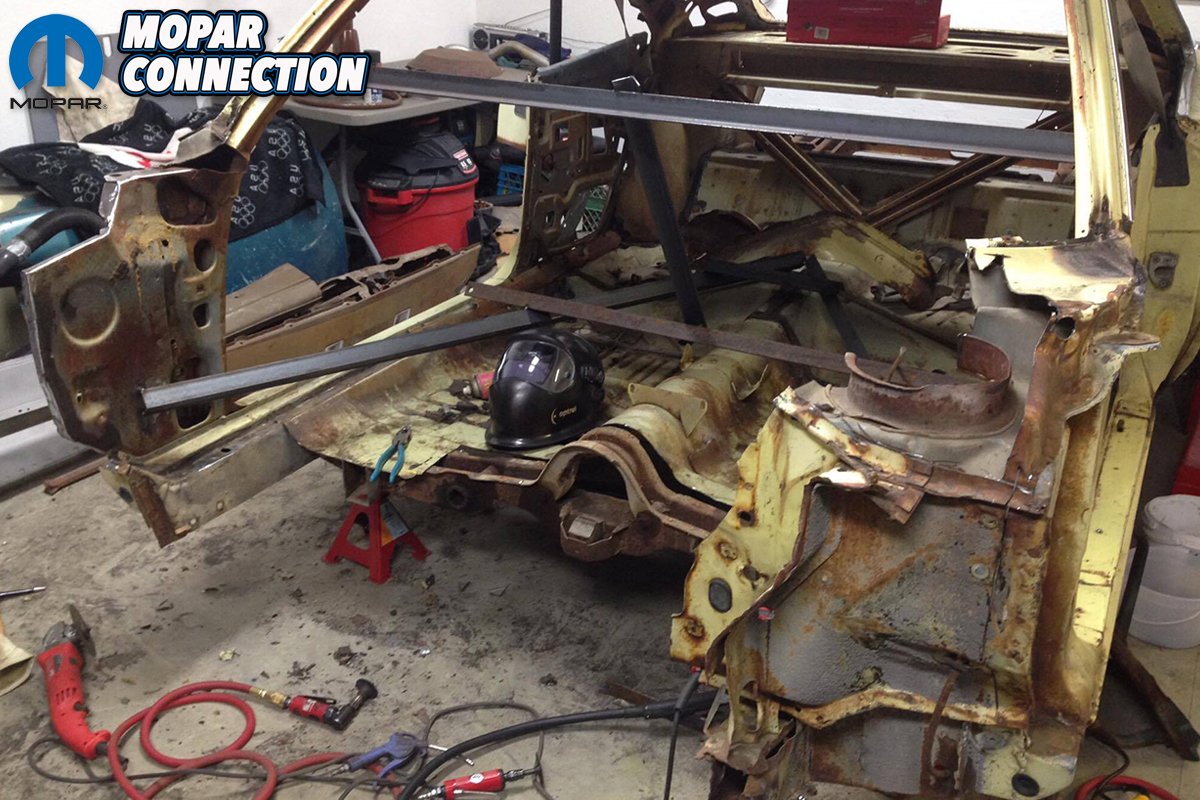Being a welder by trade, Forrest quickly brought it into his shop and started tearing it apart; cutting off the old crumpled firewall, cowl, front frame rails, inner fenders and torsion bar cross member so a complete replacement front clip could be welded on in some shot, maintaining the look of factory seams and joints. Forrest says because he goes to college out of town, it’s been a slow work in progress but thanks to a good deal on a package deal of parts off another wrecked ’69, he has now gotten the majority of the parts needed for the car. After some research, Forrest says he has found the numbers matching engine sitting between the fenders of a ’68 Chrysler Newport and is in the process of buying it back.