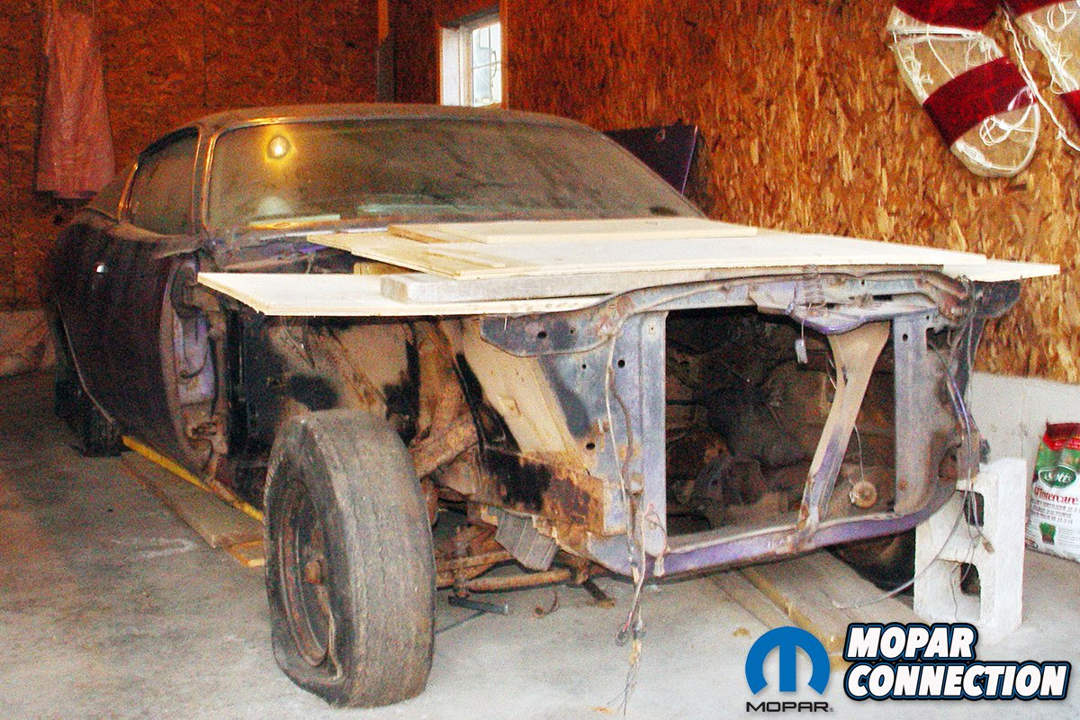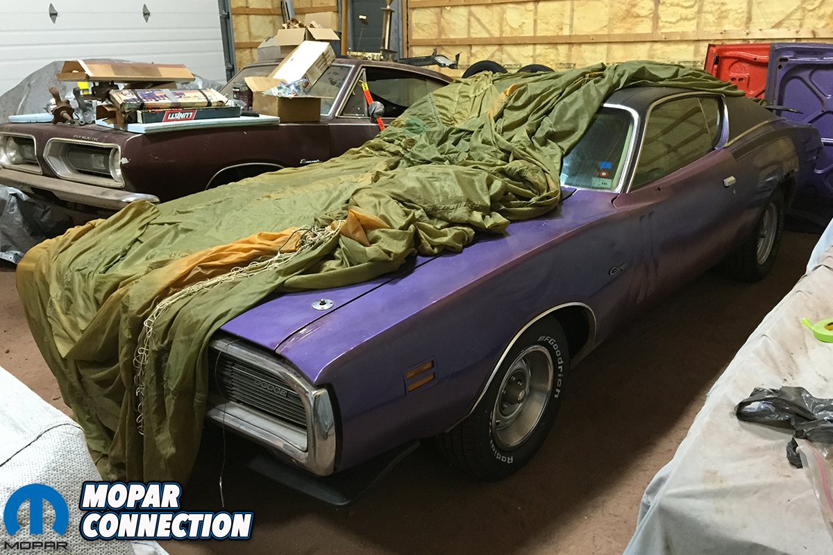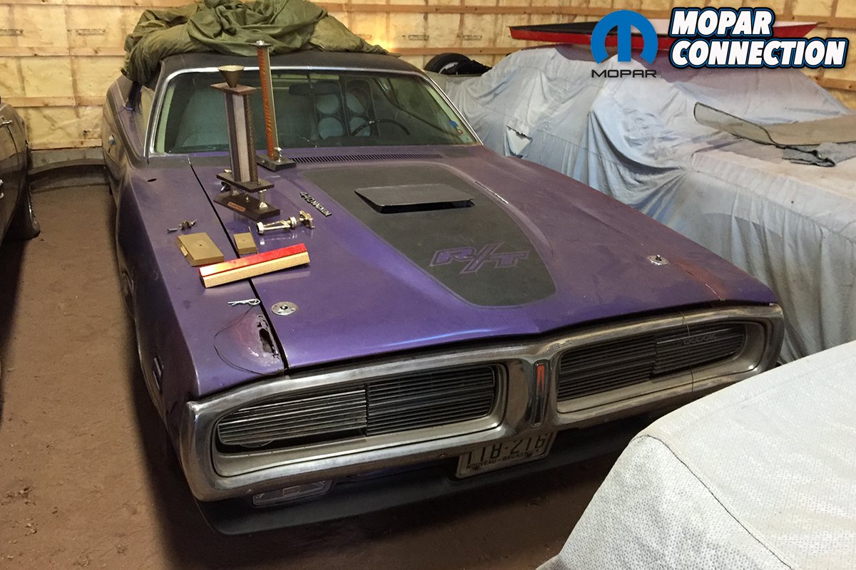 Robin took photos of Geordie’s purple Charger back in 1981 sitting next to his garage. After that, Geordie sent the car to a body shop to get the damaged front repaired. The repairman did such a bad job that Geordie frustratingly pushed the car to the far back of his garage where it sat for many years after. In September 2014, Geordie called Robin up for a chat. The topic of conversation happened to be his long dormant Charger. The entire front clip was off and the interior was piled in a heap inside the car. It sat on four mismatched rims with four flat tires, it was dirty, and very, very rusty. The original Ramcharger hood sat propped up against a wall next to the car, and boxes of Christmas decorations were covering any horizontal surface that would support them.