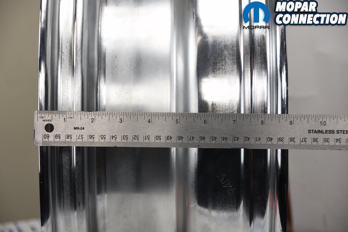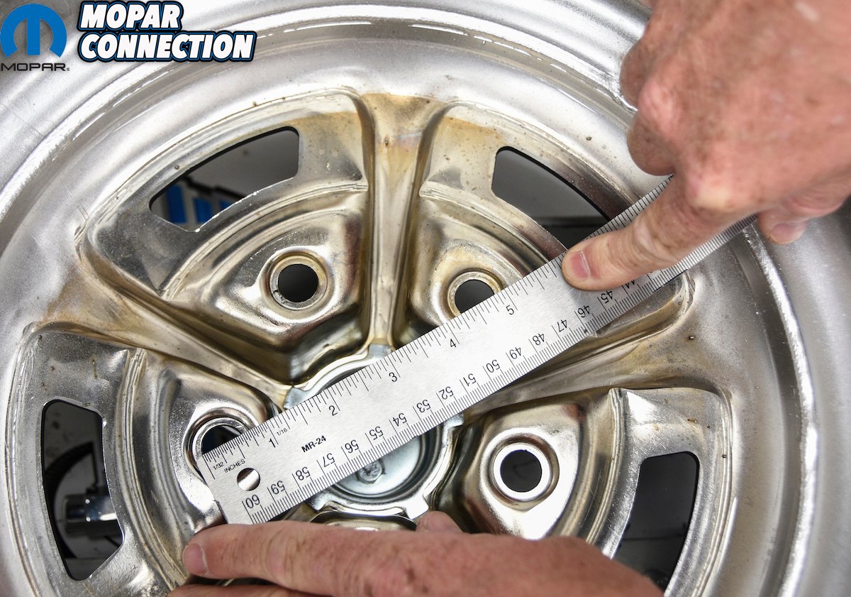 Above left: Before we get started measuring the 1972 Dodge Dart, let’s take a second to measure a wheel to get an idea of what these numbers mean. Bolt pattern is a pretty is straight forward for Mopar muscle cars from the ‘60s and ‘70s—you two five-lug patterns defined as “small” (5×4-inch) or “large” (5×4-1/2-inch). Coker Tire and Wheel Vintiques offer authentic Mopar steel wheels in both the small and large patterns. Above right: Here’s a crucial measurement that can throw off your measurements. Advertised rim width is measured from the bead seat area and not from the outer most edge of the wheel. This Magnum 500 from Wheel Vintiques measures 8 inches from bead to bead.