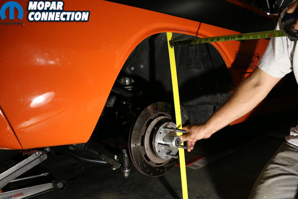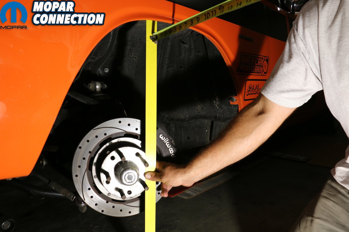 Above left: Our subject is a 1972 Dodge Dart, which features a RMS K-member with tubular control arms and coilovers. This is obviously a little different from the standard torsion bar setup that rides beneath many Mopar muscle cars. It’s important to note that track width may be altered by disc brake conversion kits or aftermarket suspension components. It is also crucial to have the vehicle sitting at ride height to get the most accurate measurements. Above right: We went with the old school method of a straight edge and a tape measure to get our baseline measurements. Devices are available to help with this process, but this is the cheapest and easiest way to do the job. We took note of every measurement and our first one is from the wheel mounting flange to the inner most point on the front fender. We came up with 5-inches, gaining about a half-inch of clearance by “rolling” the fender lips.