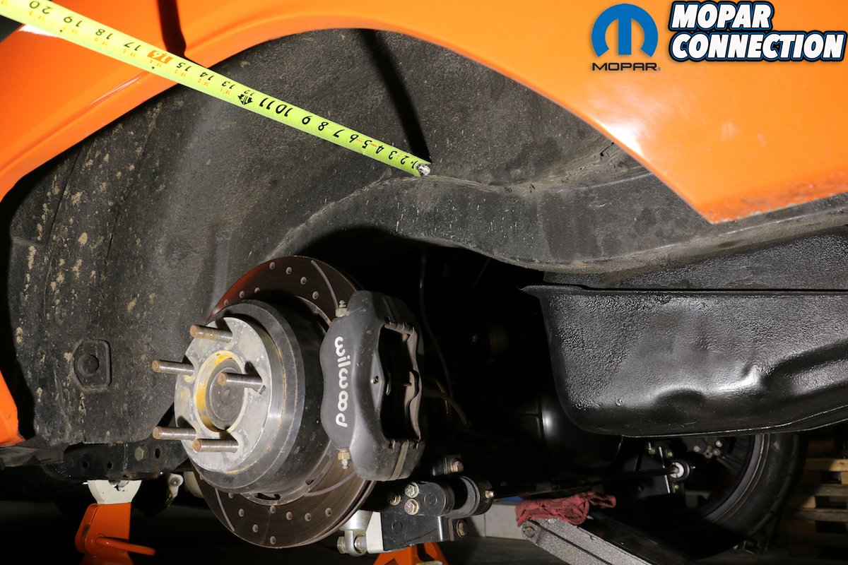 Above left: Now, we can turn the wheels to the left and take a similar measurement. This time, we are placing the straight edge on the leading edge of the mounting flange. Caster adjustments affect how far the tire tips in or tips out in harsh cornering, so be sure to have your suspension aligned before measurements are taken. Given our measurements, we can safely run an 9-inch wide front wheel with up to 6 inches of backspacing. Above center: Out back, the Dart features an 8-3/4 rear end with Wilwood disc brakes. This car has been mini-tubbed, giving us a little more breathing room and a lot of latitude for tire and wheel fitment. Above right: Measuring the rear is pretty straightforward. We start by measuring from the flange to the lip on the quarter panel. We like to allow 1/2-inch for flex, and our measurement shows 4 inches from flange to lip. Take note of the 3/4-inch spacers in place on the Dart, and always use longer wheel studs if your application requires wheel spacers for the proper fitment.