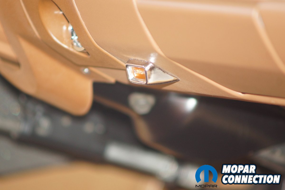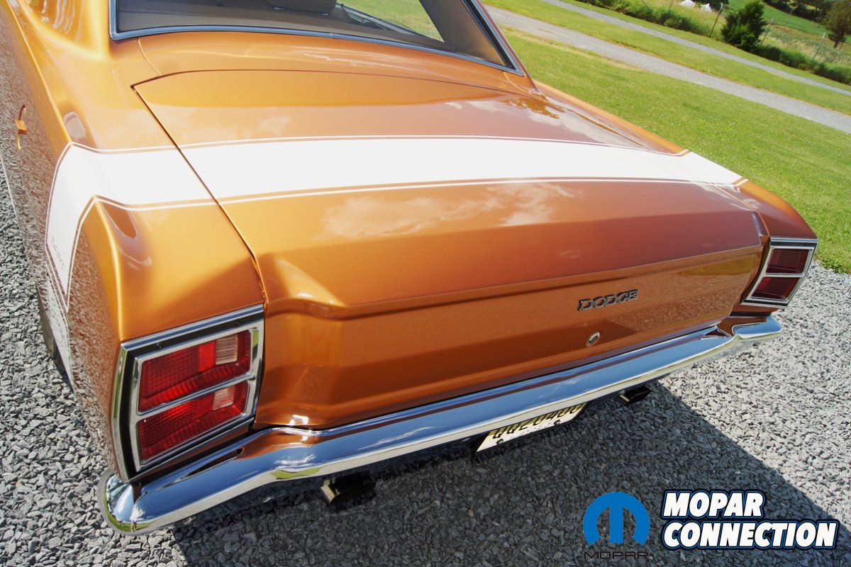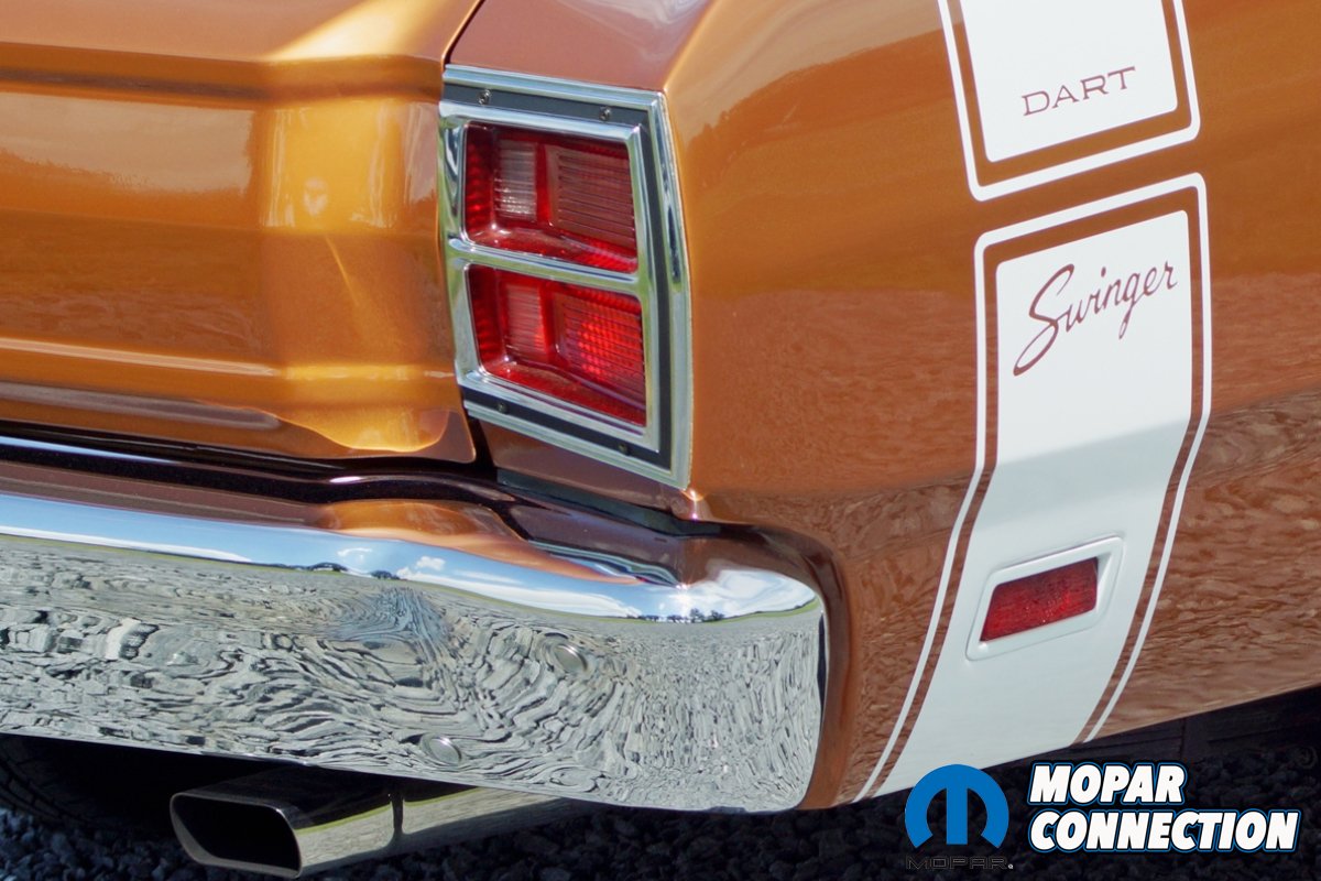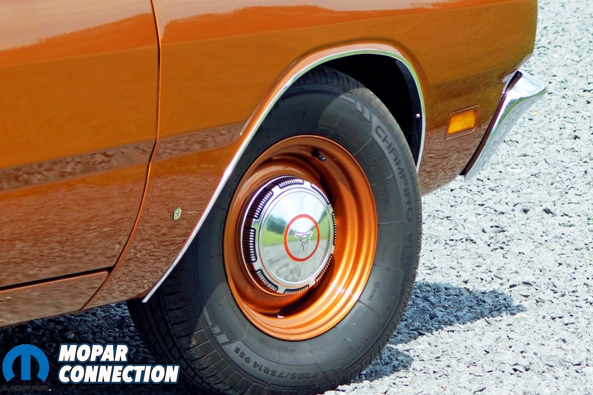 As Rich was applying the final touches to the restoration, he sent the bumpers to Tri-City Plating for minor repairs and re-chroming. Rich secured the shiny bumpers to the factory bumper brackets with new hardware. The other brightwork was polished and reinstalled, or new-old-stock (NOS) parts were located and installed to bring back the sparkle of the Dart. Rich installed 205/75R14 tires on body-colored wheels and completed the wheels with a set of reproduction dog dish hubcaps.