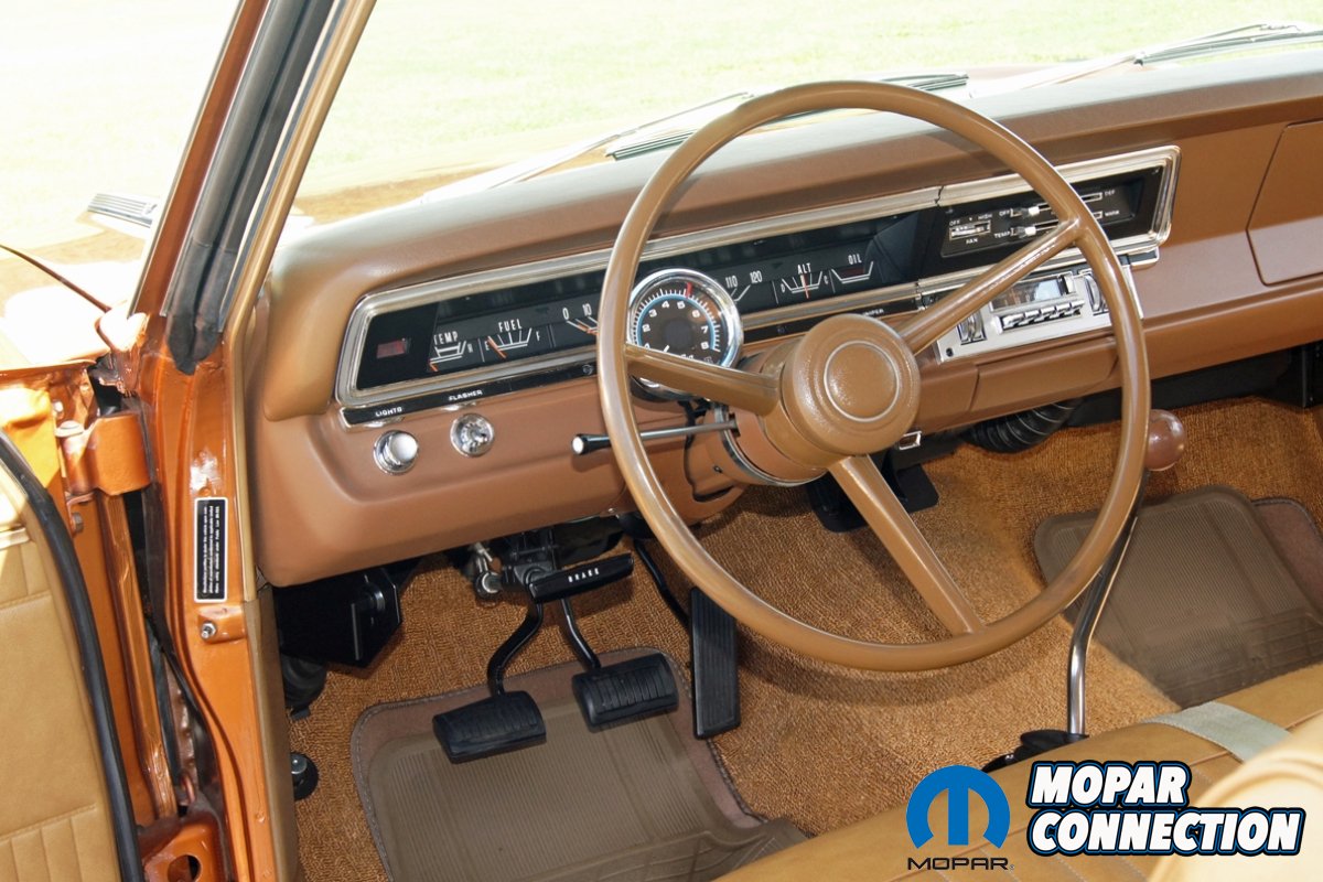 During the reassembly, Rich elected not to reinstall the 2.76:1 geared 7 ¼-inch rear end that Dave had slipped under the Swinger; instead, he installed a 3.91:1 cogged 8 ¾-inch rear end. Fortunately for Rich, he was able to find a local Mopar parts vendor that was parting out a ’68 Dart. Rich purchased the front bench seat to replace the pair of non-original front buckets, contacted Legendary Auto Interiors for the correct Saddle Tan Deluxe seat covers, and completed the entire seat cover installation of the front and back seats by himself.