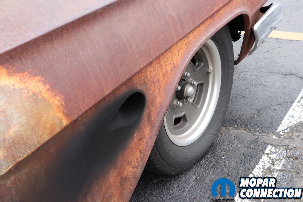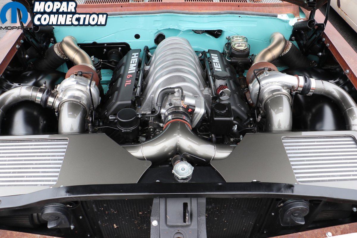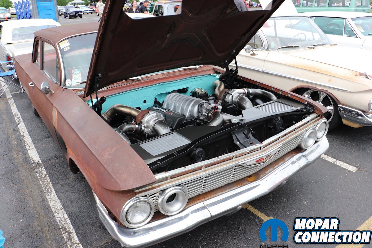 The Goolsby Customs tent featured several customs, but stood out far beyond the rest: Kasper, a wild retro Pro-Street inspired ’74 Plymouth Duster powered by a Hellcat Gen3 Hemi and Bowler Performance 6-speed transmission. Equipped with Vintage Air and massive 6-piston Baer Brakes brought the 700-plus-horsepower A-body to a halt, visible through the custom one-off EVOD 18-inch wheels. In the general parking area, I eyed an usual sight; a heavily oxidized ’61 Chevrolet Biscayne touting a wild twin-turbo pressed 6.1L Hemi with scalloped blow-off ports cut into the front fenders. Chevy purists loathed the car. Personally, I loved it. You decide where you stand on it.