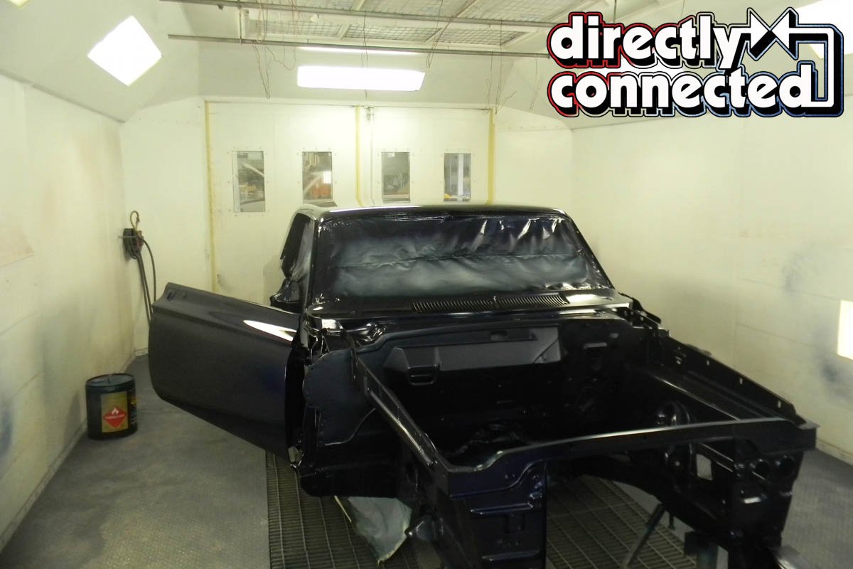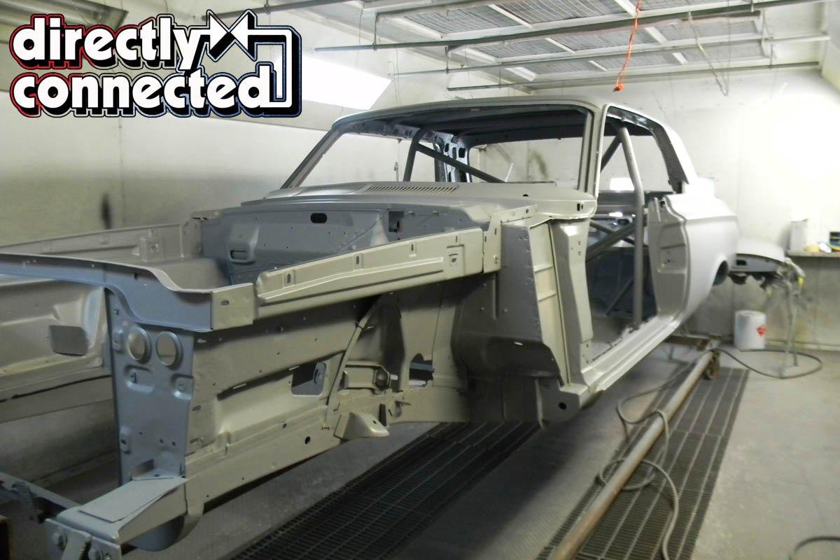 Above far left: One of the few areas of rust on the vintage B-Body before it was repaired. Above center left: The Dodge is in the booth and the first coat of primer has been applied. Above center right: The aluminum front fenders and hood have been hung for final check fits before they are removed that the Dodge is painted. Above far right: The Kona Blue has been sprayed and the paint is curing in the booth.