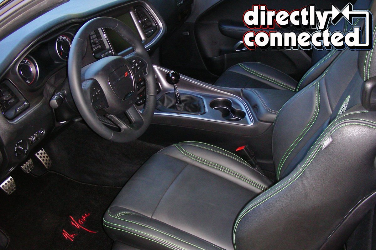The interior of the 2015 Challenger is new from top to bottom, and it’s a marked improvement over the preceding model. Proving the old adage that anything can be improved upon, Mr. Norm worked with the artisans at Katzkin Leather to create a custom interior for the GSS Hall of Fame Edition. Instead of the standard cloth interior it was originally equipped with Mr. Norm upgraded the vehicle with soft, supple custom leather in a deep black hue. In the case of this Challenger, for the special Hall of Fame logos and contrasting top stitching on the seats, Katzkin was able to provide thread that was a perfect match to the Sublime green paint on the exterior. The result is the perfect blend of colors to complement the exterior. Additional interior touches include the Mr. Norm’s embroidered signature carpet mats,