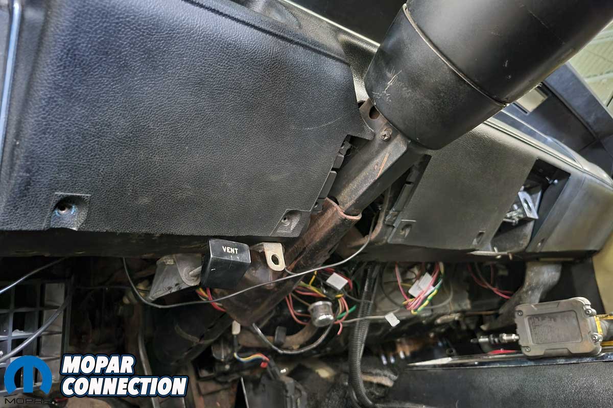 The plan is to add Vintage Air, and since the center bolster has no vents, we got lucky while looking around the Holley’s Moparty swap meet and saw a center section with A/C vents for a B-Body, so we grabbed it for $100. After a bit of modification to the mounting holes of the center section, we got a tight fit next to the glove box door.