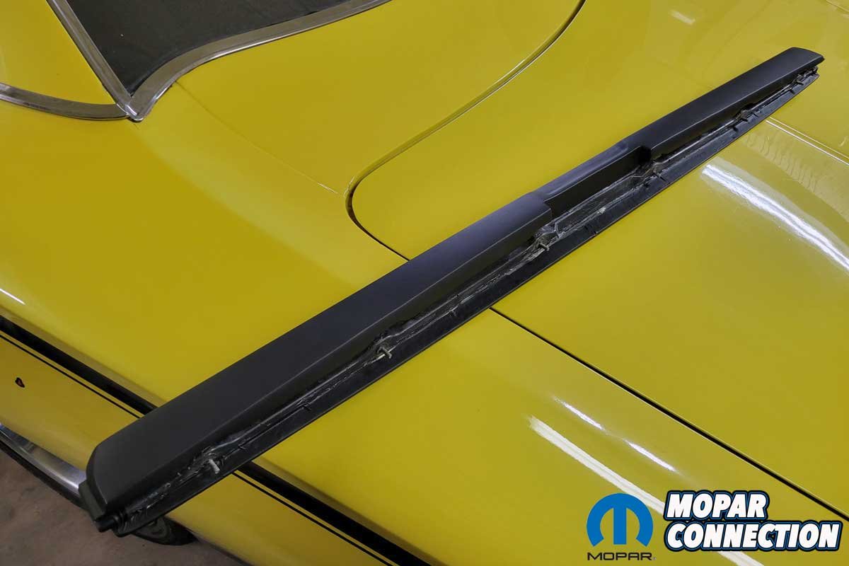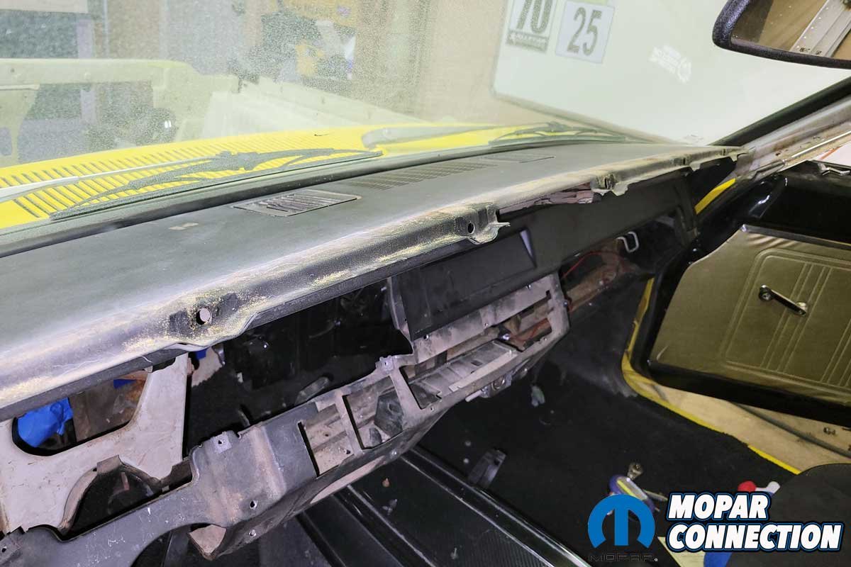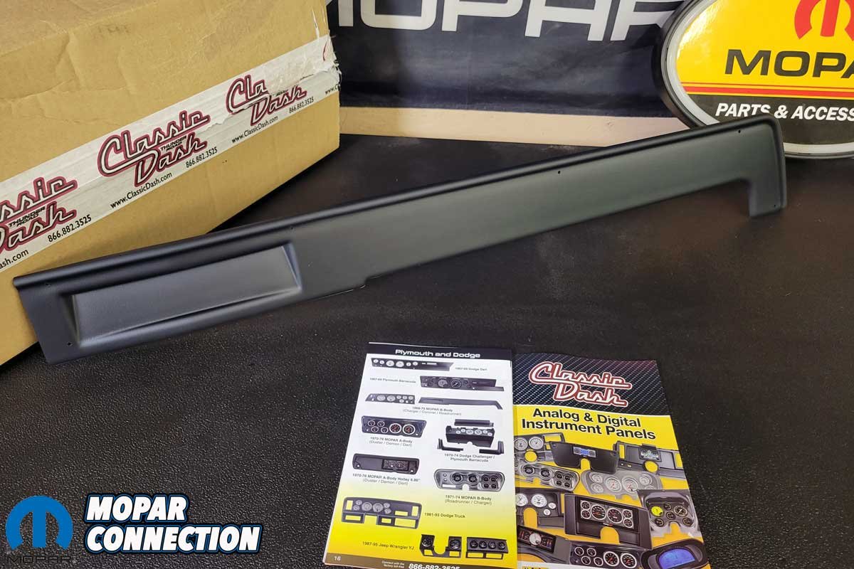 The metal dash structure was free from damage, and it was not faded, so we bolted on the new pad. On the right side of the dash, two large holes had once housed aftermarket gauges. A Classic Dash kit (Part No. 718680011) designed for B-Body Mopars was selected. It would cover both holes and the radio hole that remained after the radio was deleted.