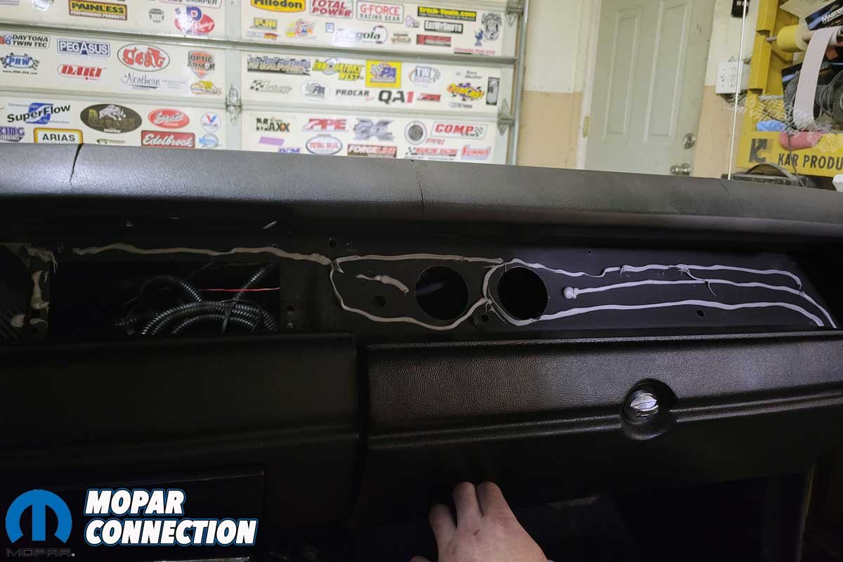 Above: A Classic Dash 1968-70 Mopar B-Body Dash Panel was selected for the Super Bee. We glued the panel above the glovebox, over two round holes, and the radio opening.