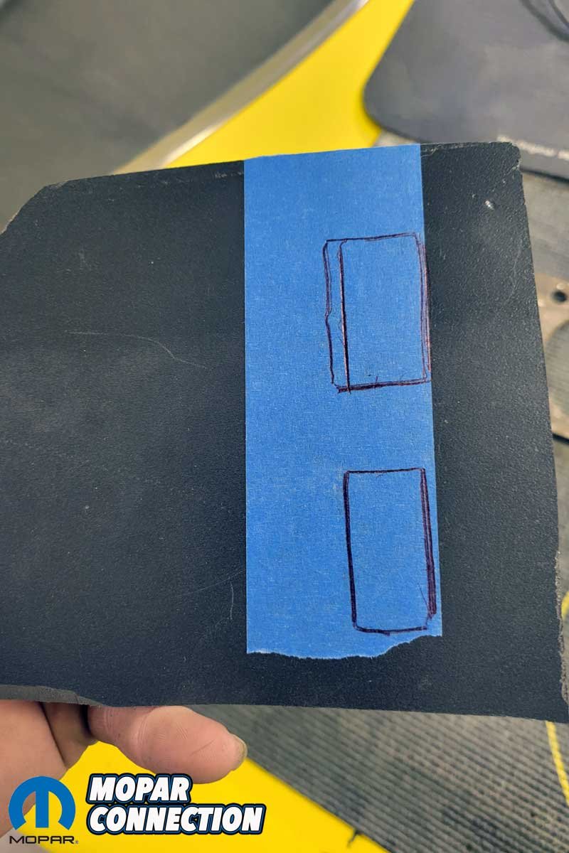 Above: We marked the location where we planned to install two factory toggle switches. We selected black expanded PVC to construct our finish panels. It is easy to cut, shape, and notch, which allowed us to mockup several quality panels that fit around the Digital Dash properly.