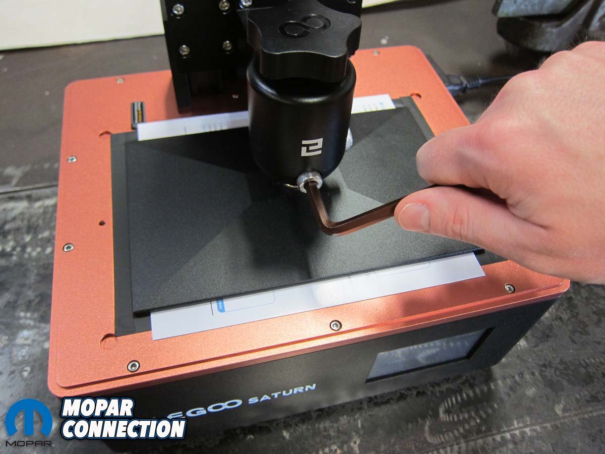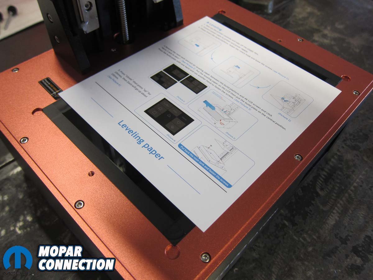 Leveling the build plate in relation to the LCD screen was the first step. With the supplied leveling paper laid flat on the screen, the plate was installed with its two locking bolts loosened. A push of the home button brought it down to screen level where we were able to lock it in to place.