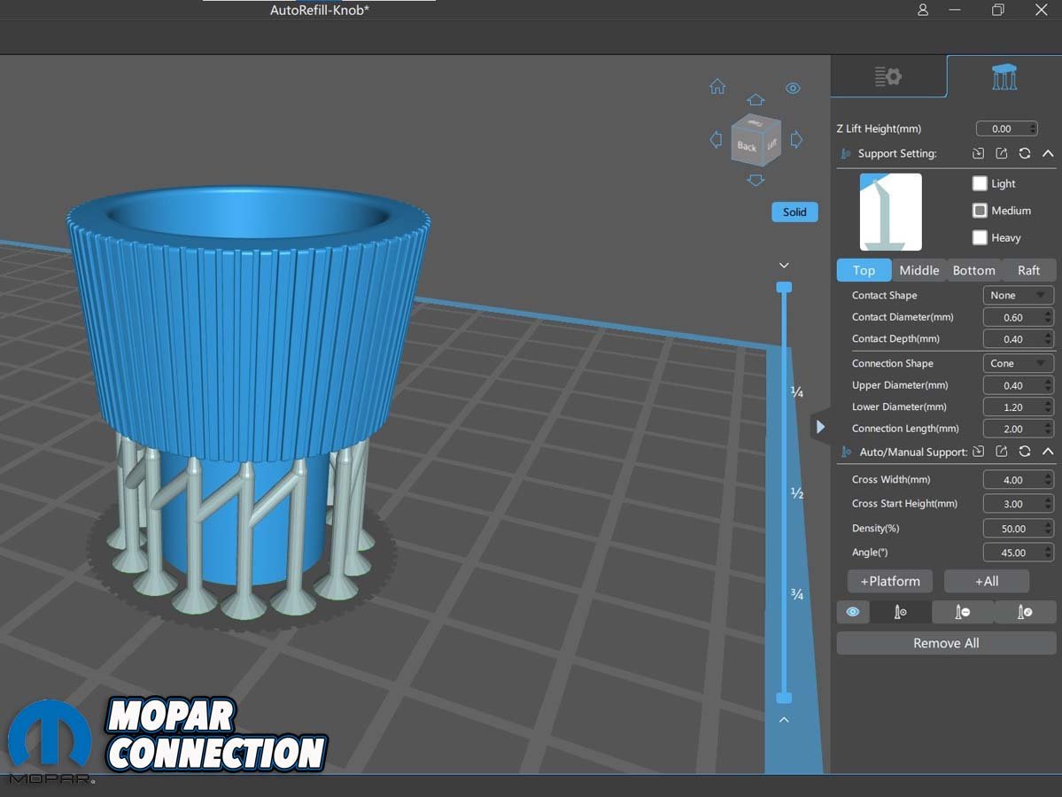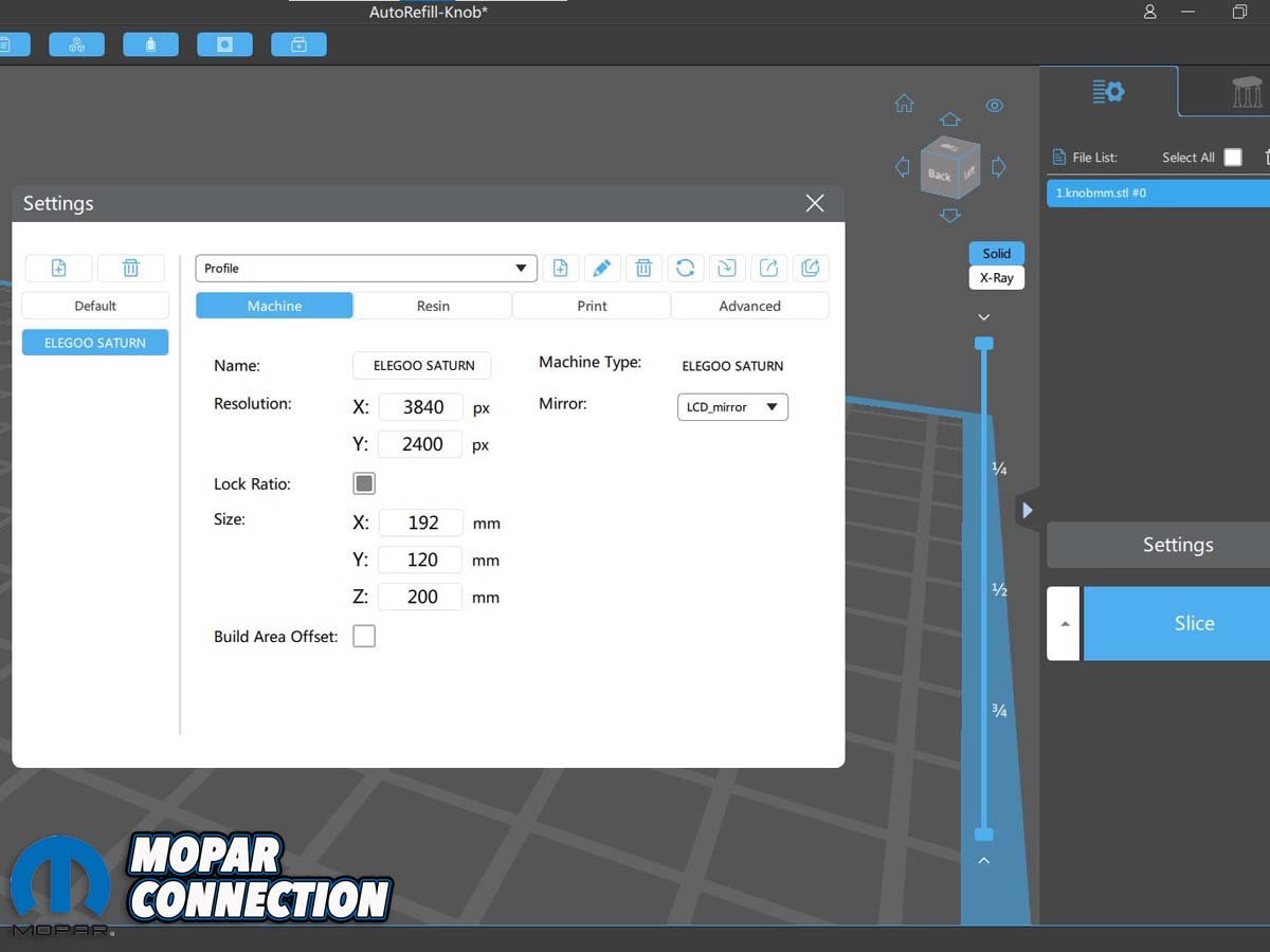 Above Left: Chitubox came preloaded on a USB with settings to print on the Saturn. Above Right: This is what our headlight knob looked like before slicing.