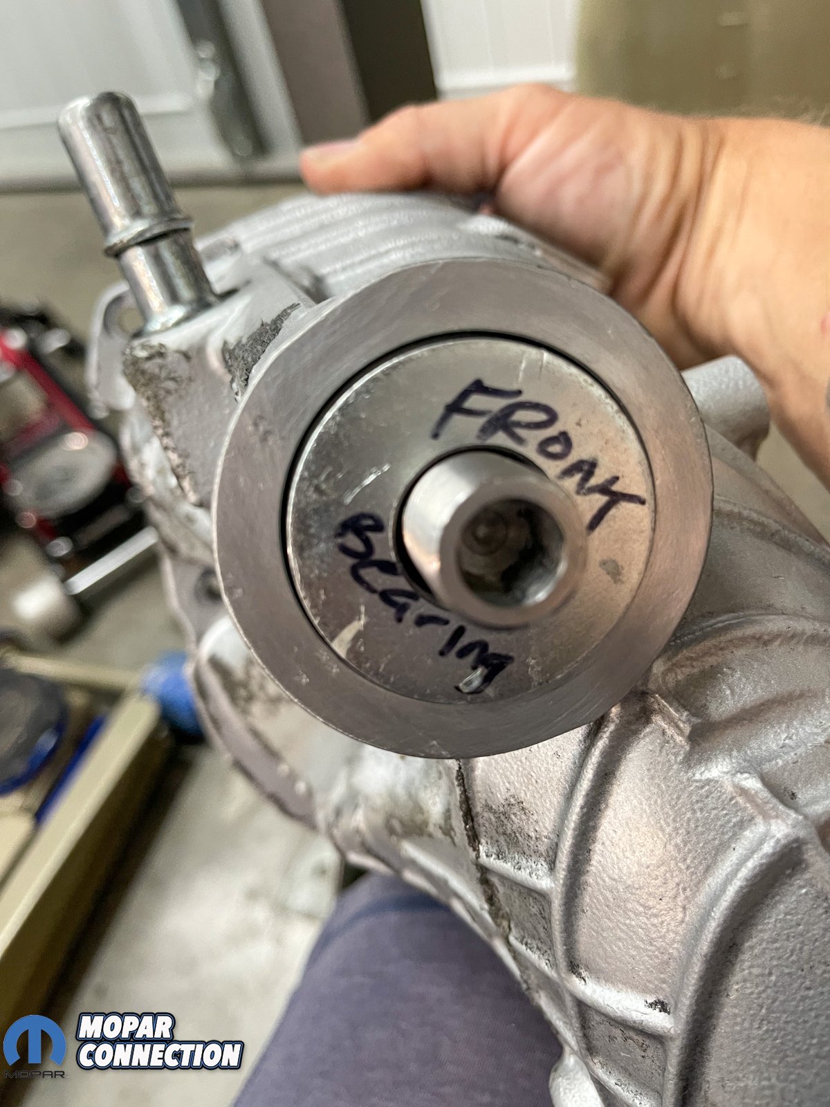 We again flipped the snout and measured the recess of the bearing with our micrometer. It was determined our recess depth was correct. Once satisfied with the bearing location, we staked the rear bearing to the snout housing.