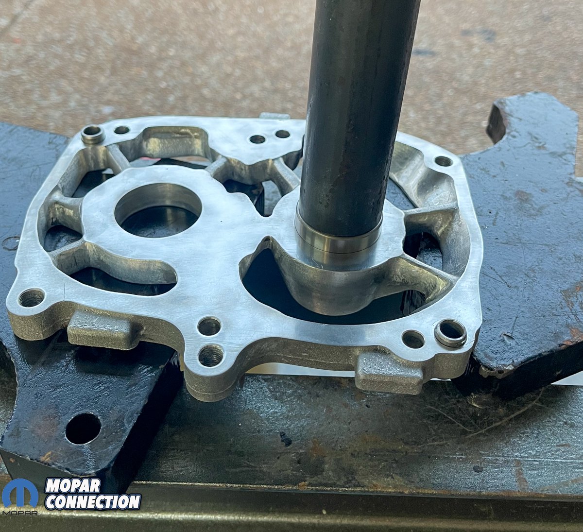 Once the plate was in place, we threaded a coupler bolt in the rotor and used a wrench to rotate it. It turned freely. If the rotation encountered hard spots or did not turn, the supercharger would have required disassembly to determine the source. The rotor spun freely, so we applied a thread locker to the plate bolts and torqued to 40 ft-lbs. Satisfied, we installed the drive coupling and core plug/air cap. Lastly, we installed the drive bushings and freeze plug on the driver-side rotor.