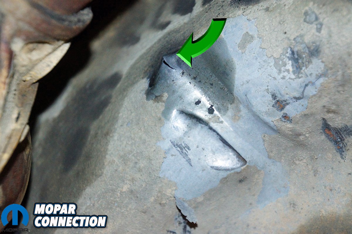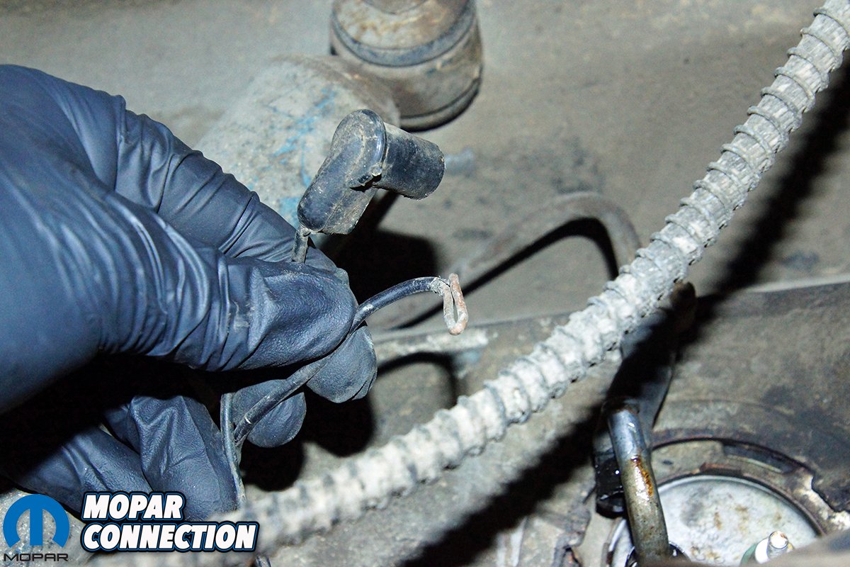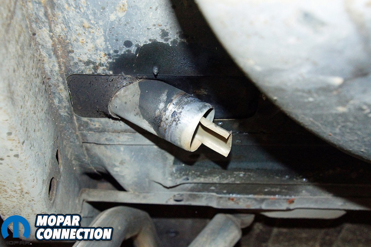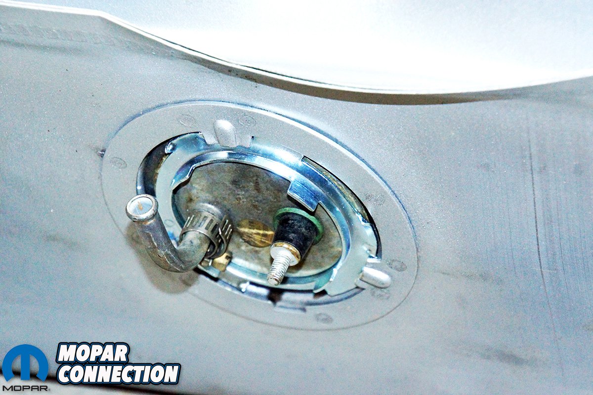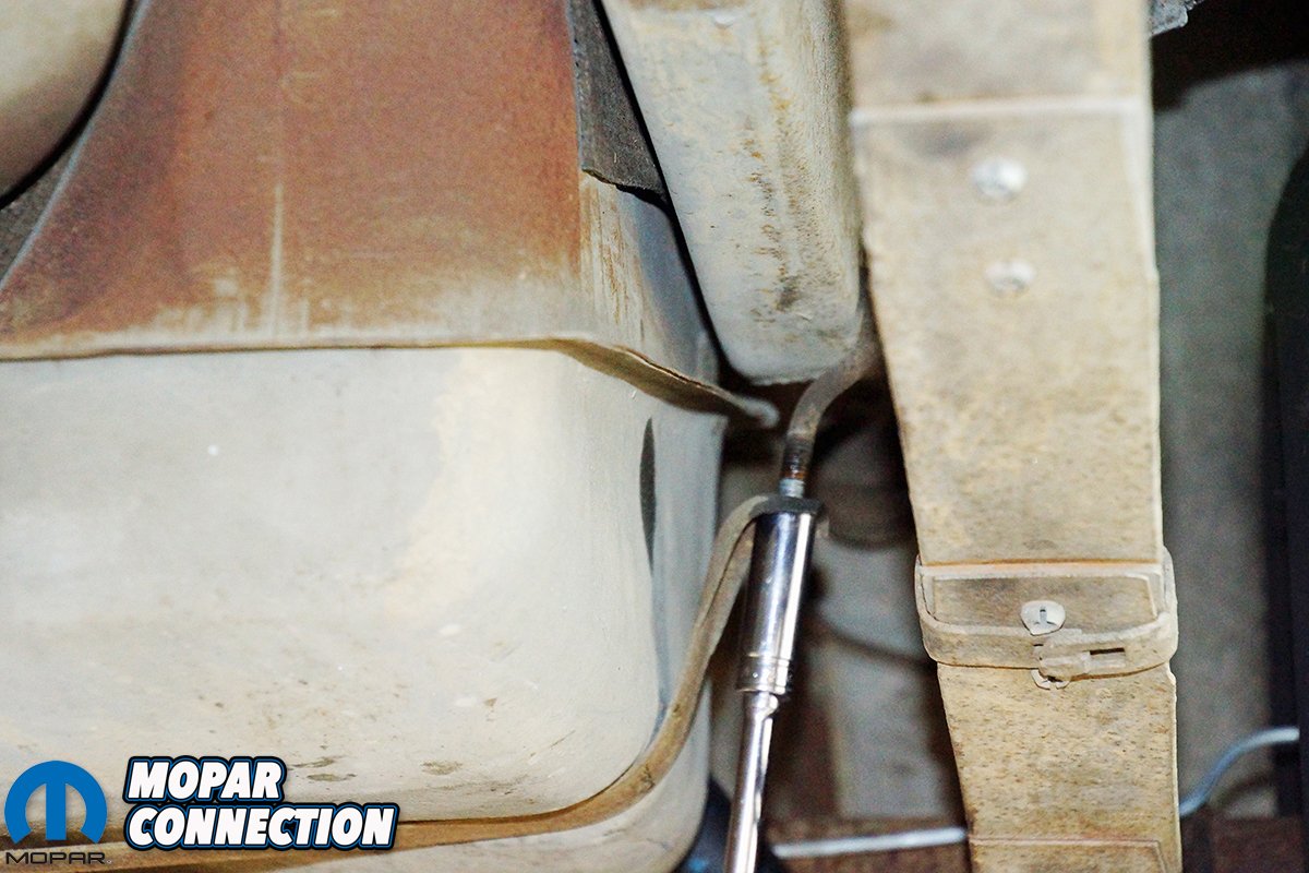 The factory tank strap and rubber insulator were in good shape, so we reused them. We maneuvered the strap into the factory anchor on the driver side of the Dart. Once the strap was anchored, the tank filler grommet was carefully guided onto the filler neck. An upward push allowed the strap to wrap the driver side contour of the tank. We reinstalled the factory J-hook into the passenger side of the chassis.