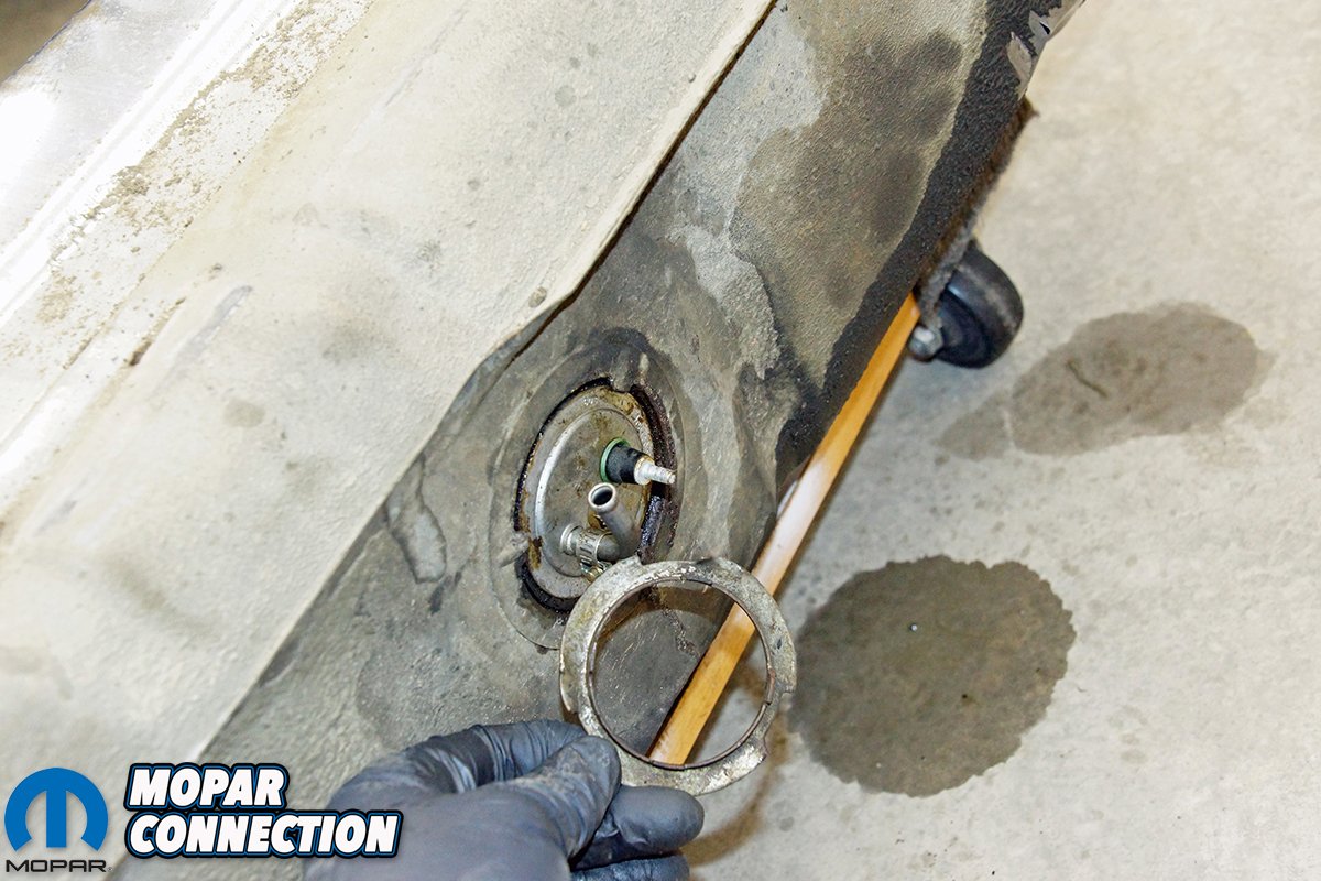 The 1967 A-bodies have only one transverse tank strap rather than a pair of longitudinal straps. We backed off the strap’s J-hook nut at the passenger frame rail and dropped the passenger side of the tank onto a 2×4, which supported the tank. You could easily utilize the ground to support the tank also. The driver side of the tank strap was maneuvered from the frame rail, the tank was pulled off the filler neck, freed from the chassis, and placed on the floor.