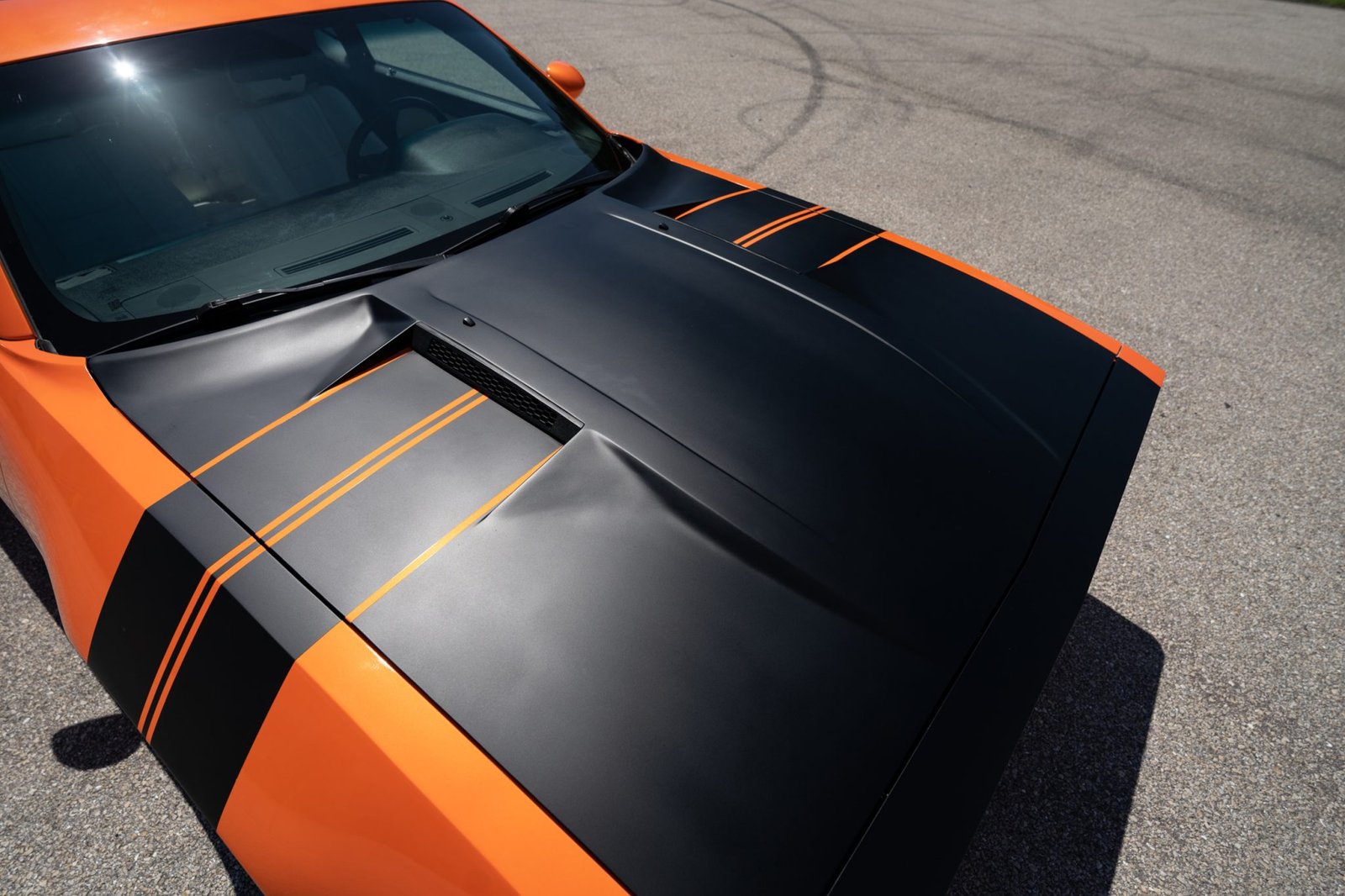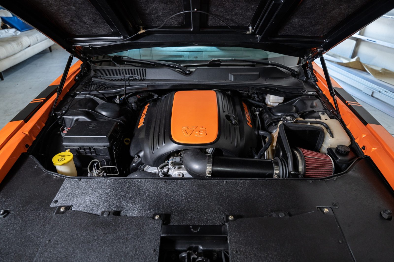 Once all the fabrication work was complete, it was time to move on to bodywork and paint. The color of choice was Tangelo by House of Kolor with a matte black hood and accents. The interior is basically stock 2010 Challenger other than the seats being recovered in Katskins white leather and some matching door panel inserts. Drivetrain is all stock 5.7 Hemi with the 5-speed automatic trans. The brakes were upgraded to the optional Brembo brake system. In all, Steve estimates about 1,800 hours of work went into the build.