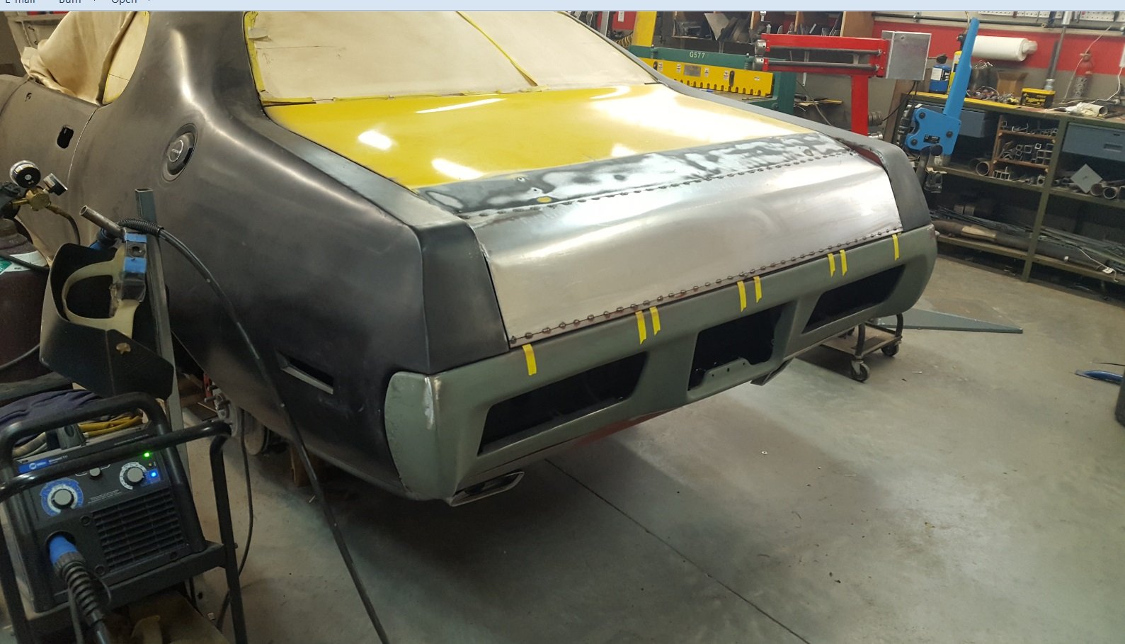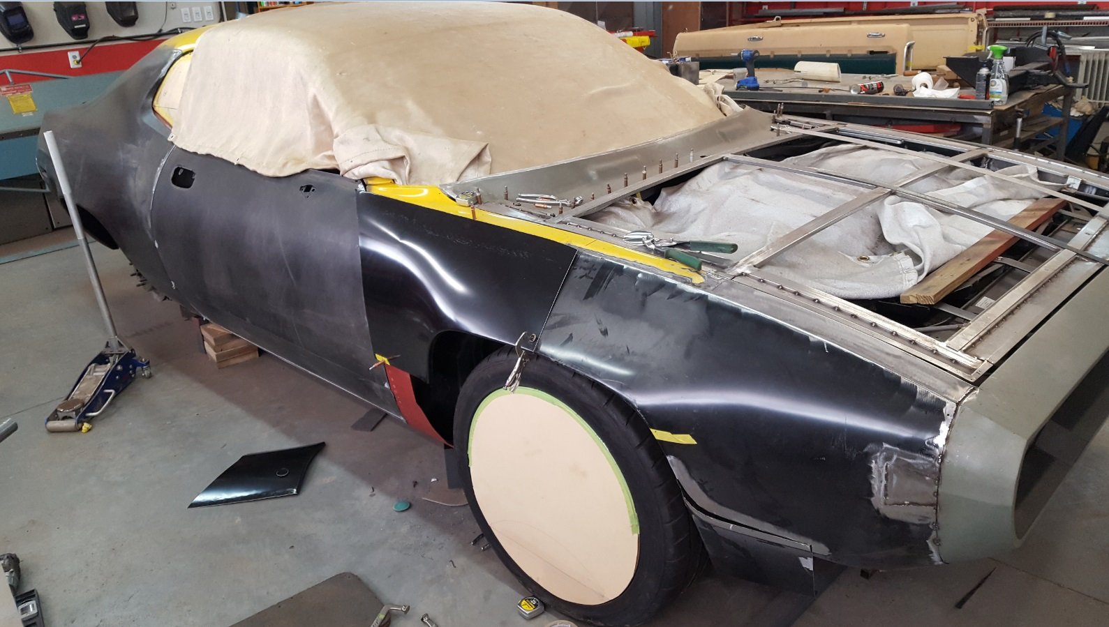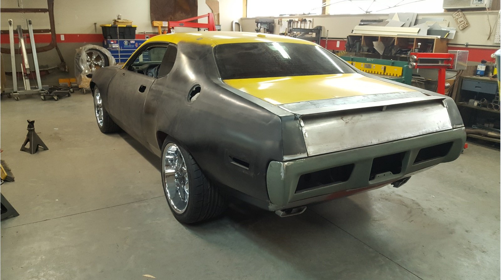 The wheels started turning and Steve decided he was going to bring this GTX rendering to life. Staring out with a wrecked 2010 Challenger R/T, the first order of business was to get the accident damage repaired so he had a straight and square body to work off of. Steve’s many years in race car fabrication came into play when looking at how to attack this build. Steve called it a “green house down build.” This is a term used by body hangers when reskinning a wrecked race car body and everything is replaced from the windows down.