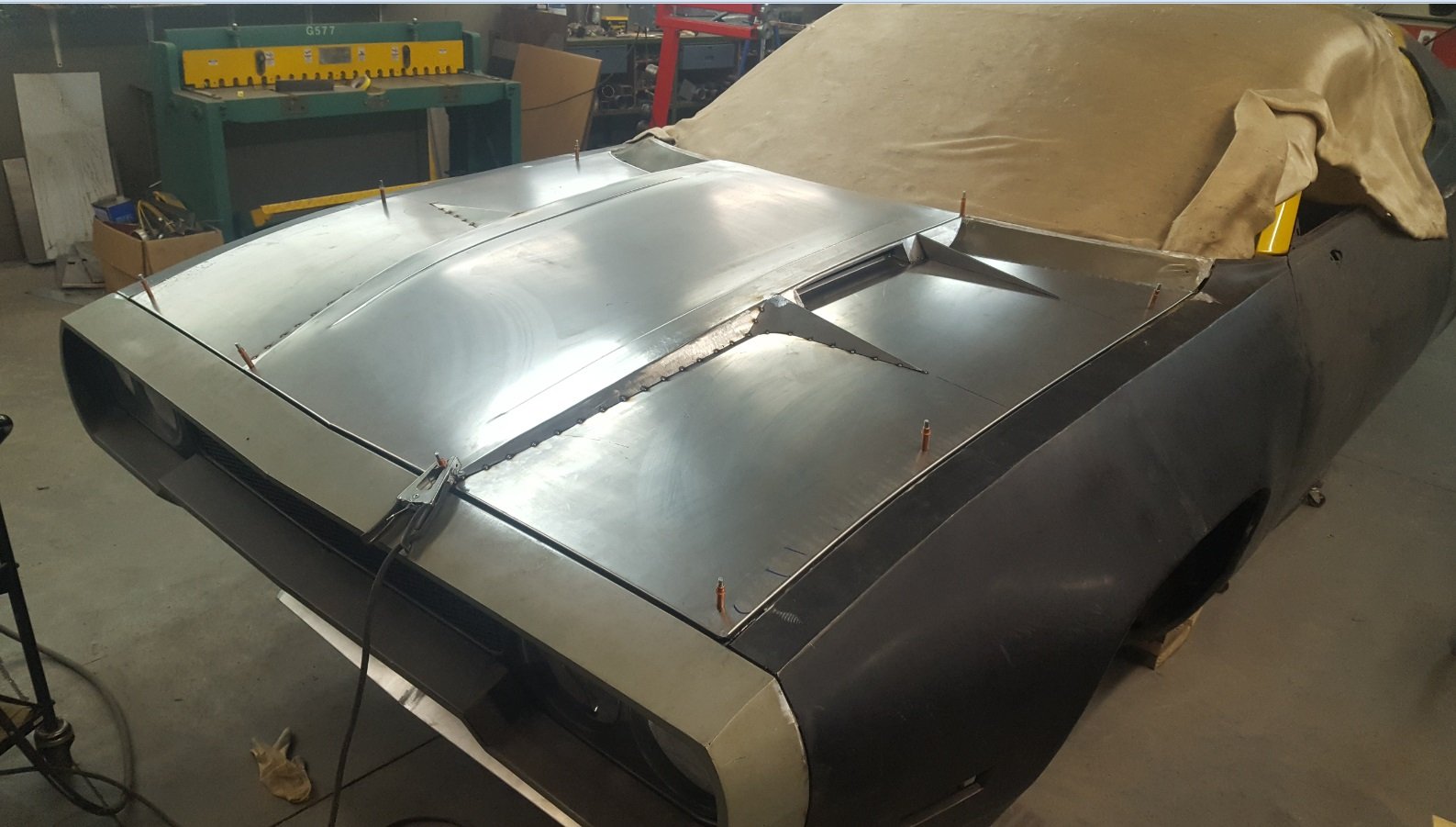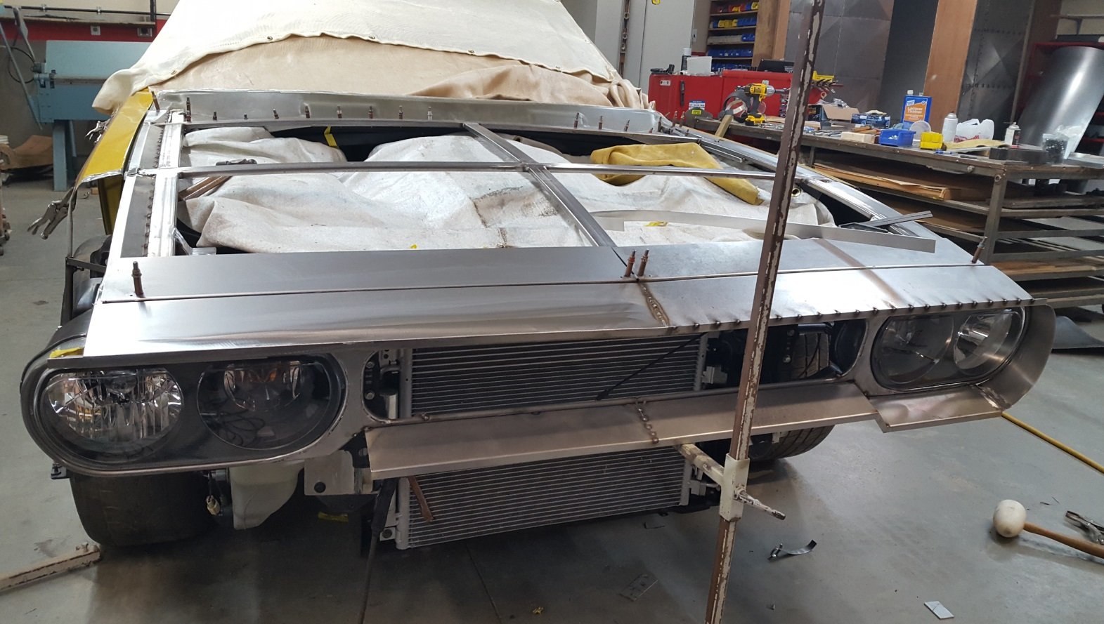 Next came tying the front to the rear by hand fabricating new door skins. The trunk lid had to be modified to meet the lines of the quarters and the rear bumper. Up front the entire hood had to be created including the inner structure with the top side paying homage to the 1971 Power Bulge hood. More custom fabricating needed done to create a new grille while retaining the stock Challenger headlights. Grille surround and front valance were all hand formed.