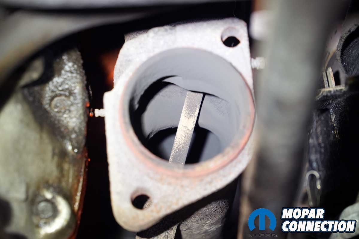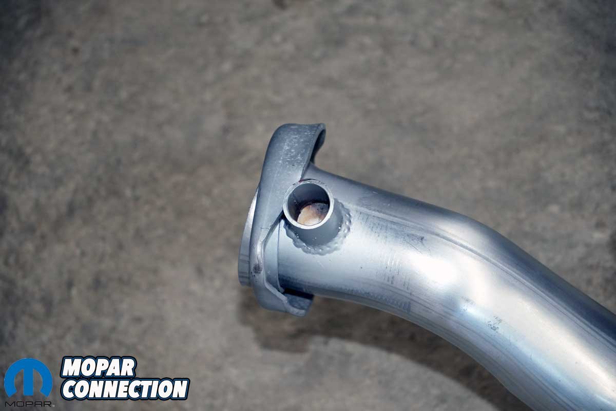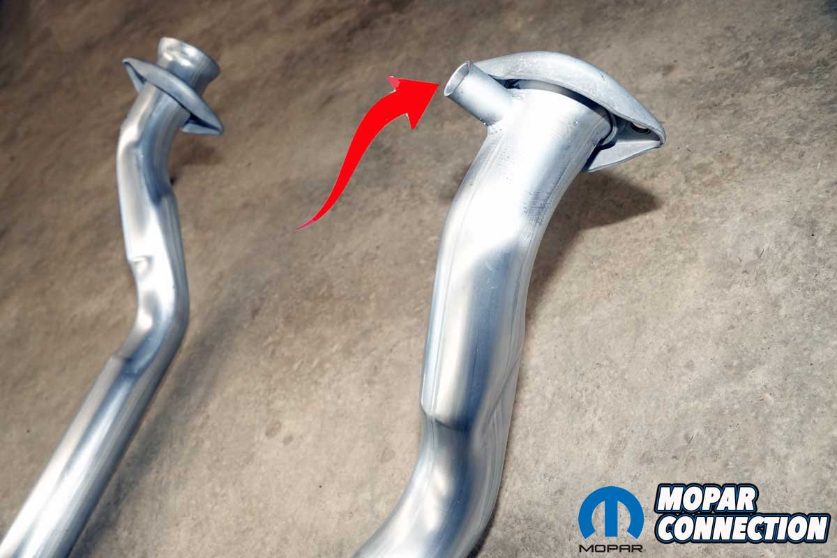 Above Left: Accurate Exhaust supplied a factory-style aluminized H-pipe kit for our B-body Road Runner. Above Right: The H-pipe includes a provision for a carburetor heat tube. Since our car uses a manual choke and the tubes had already been removed, we left it blocked.