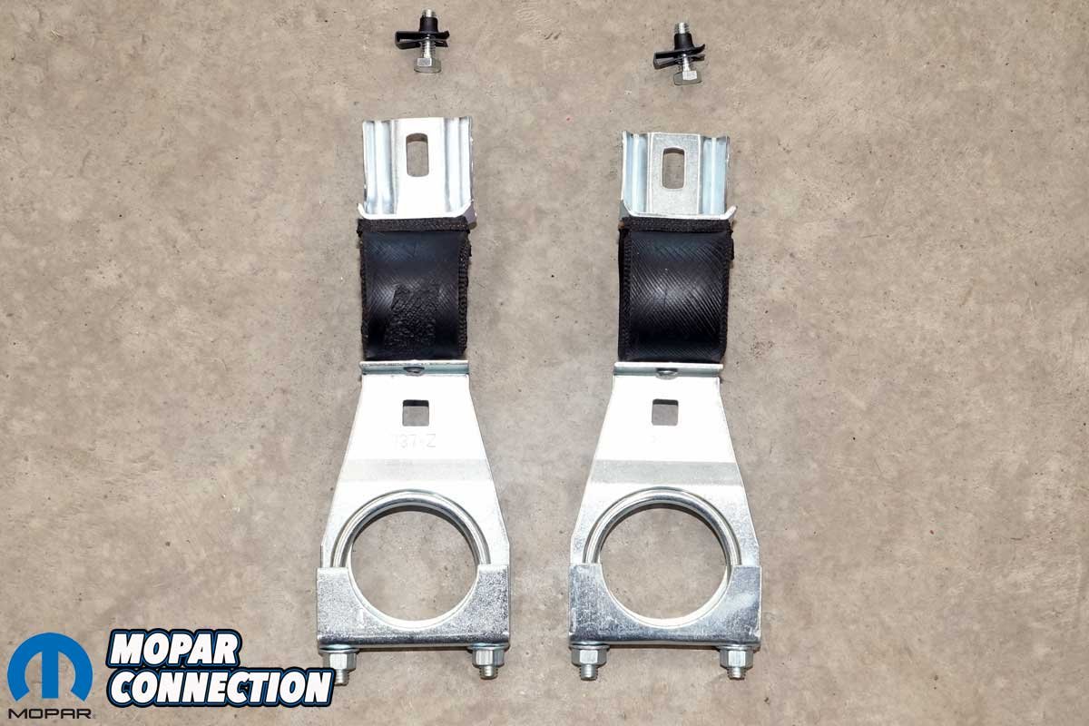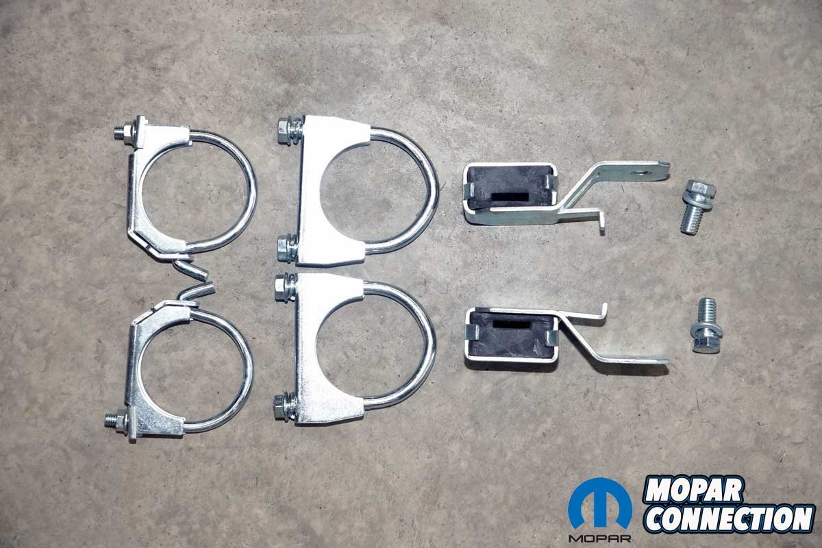 Above Left: The kit included factory-style exhaust hangers that support the system at key points, securing each muffler outlet and the over-axle pipes. Rubber insulators, just like the originals, help minimize vibration transfer into the chassis. Above Right: Also provided were Q-clamps, U-bolts, exhaust tip brackets, and all necessary mounting hardware to complete the installation.
