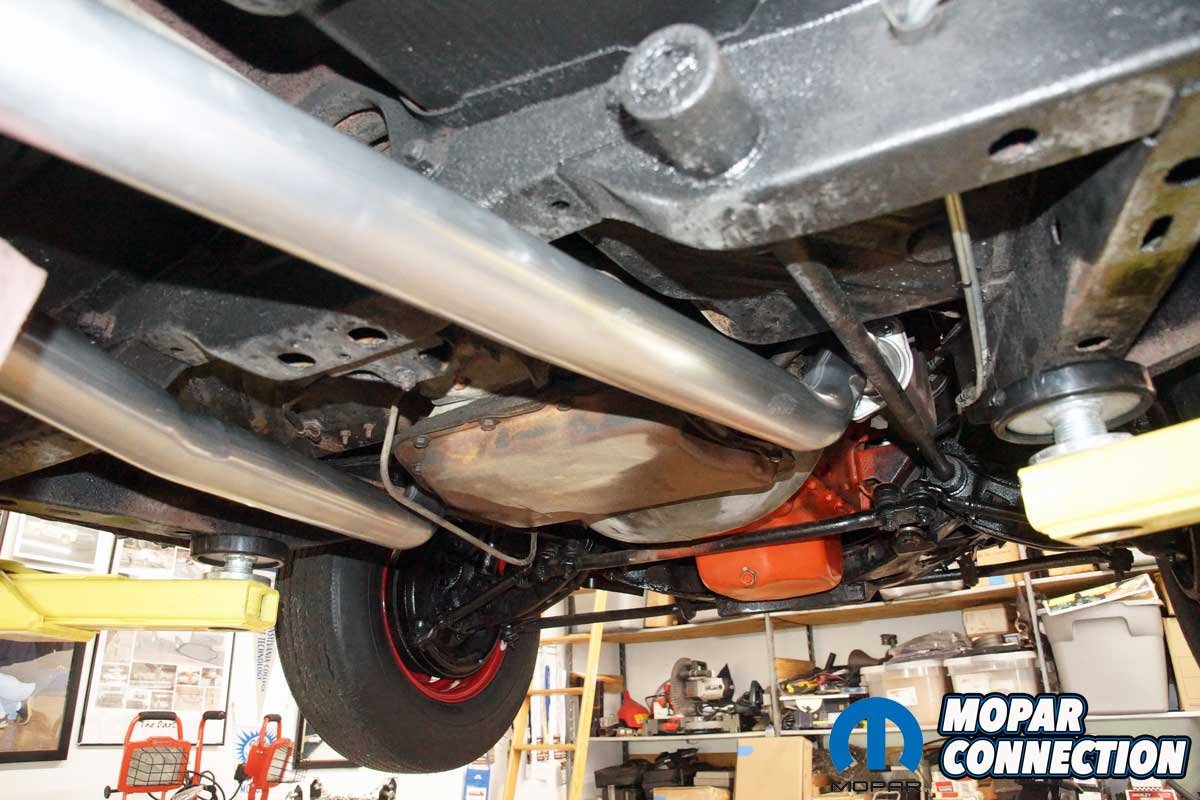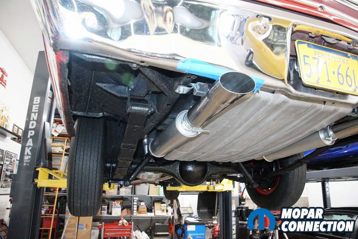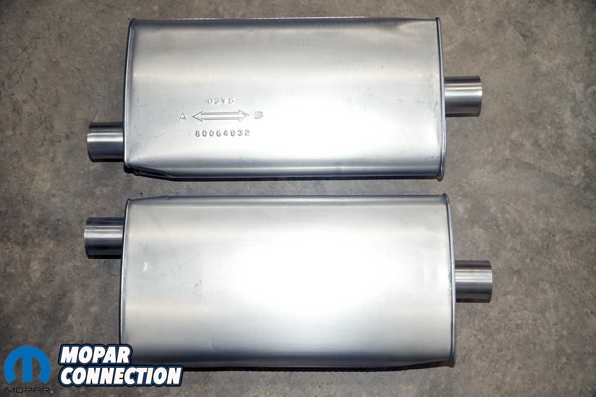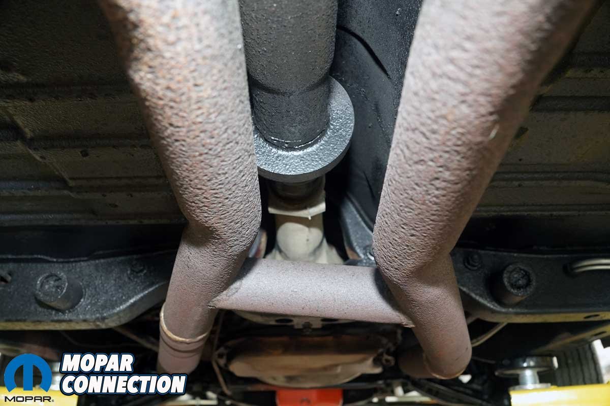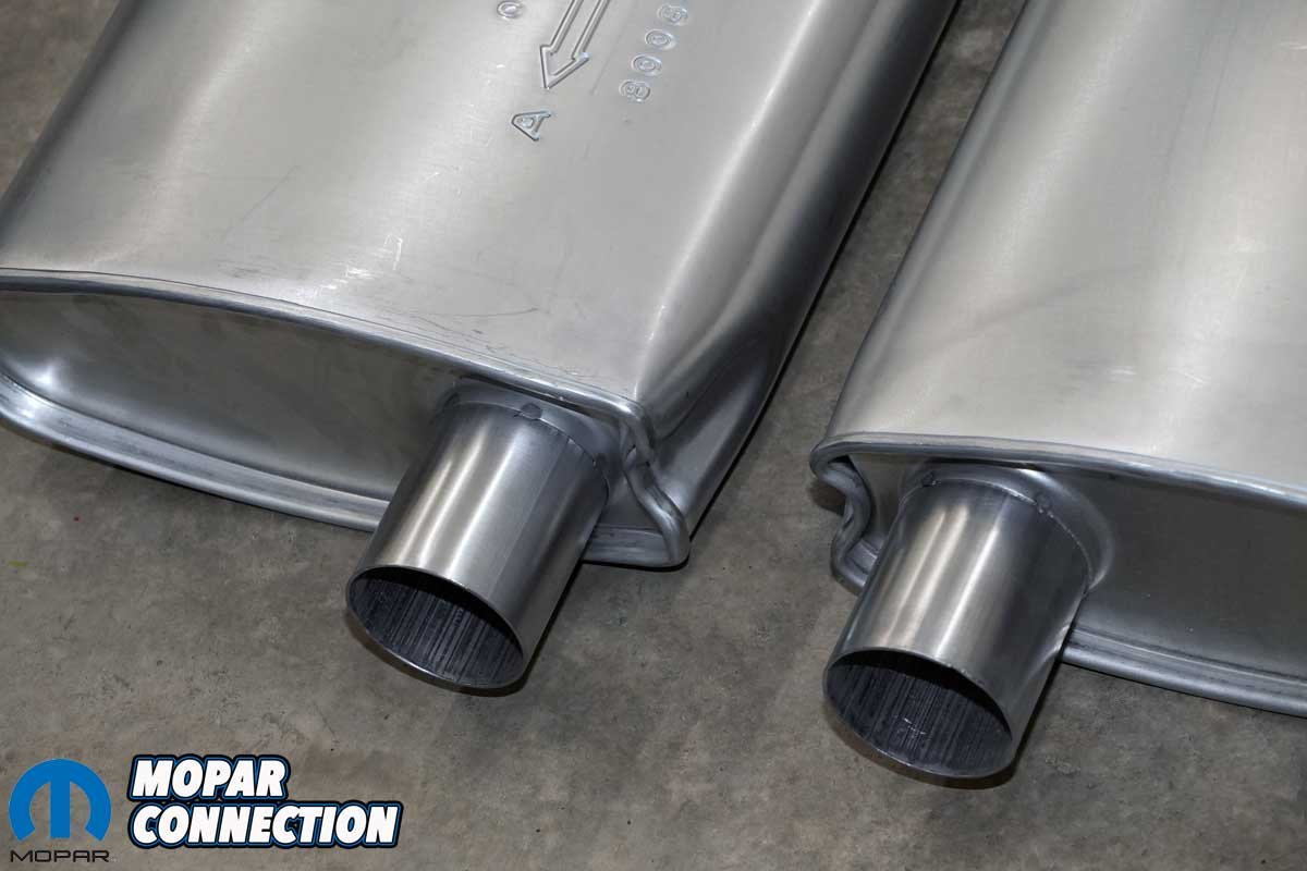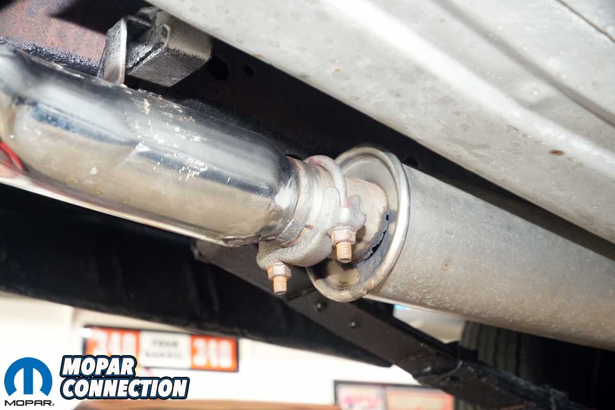Next came the mufflers. Both had an offset inlet and center outlet. Each slipped over the H-pipe outlets and featured proper indentations for drive shaft and parking brake cable clearance. We loosely installed two 2½-inch U-bolts to hold them in place.