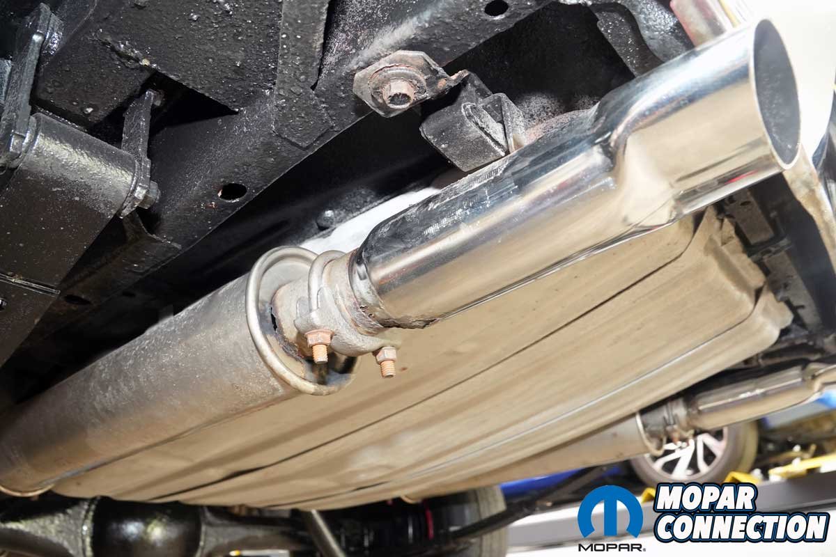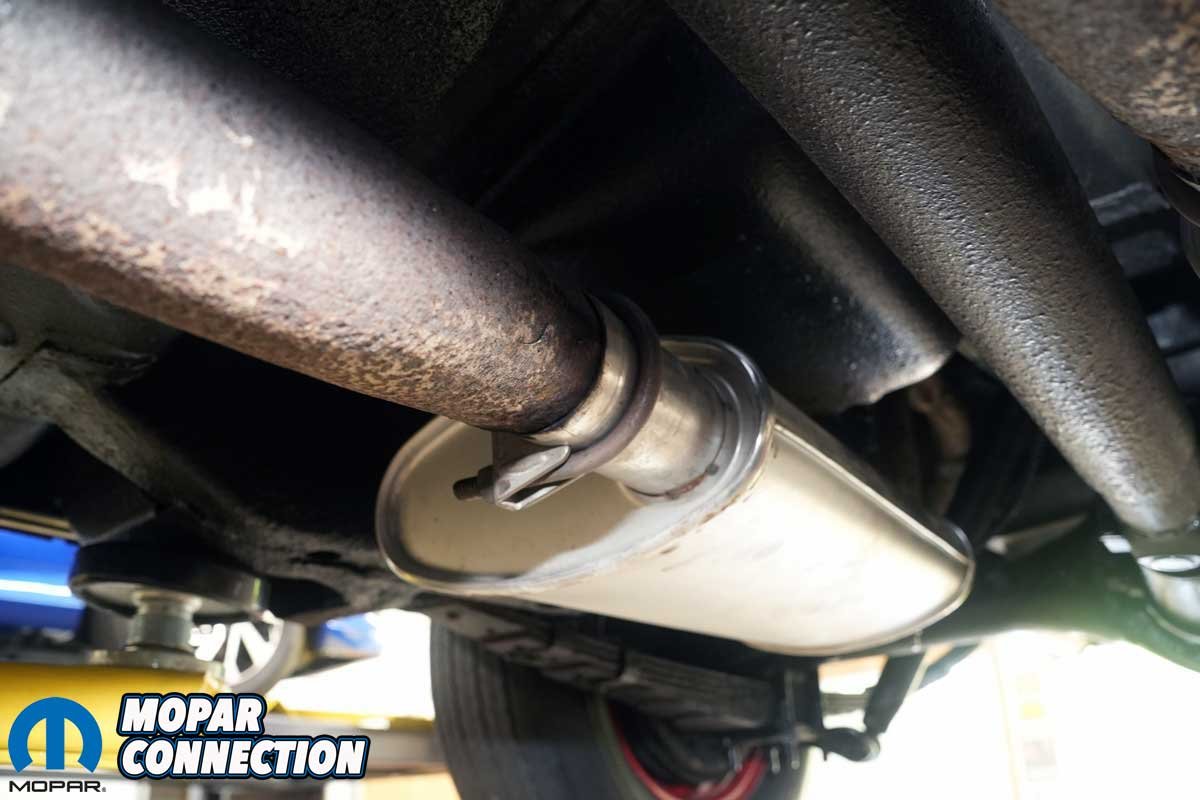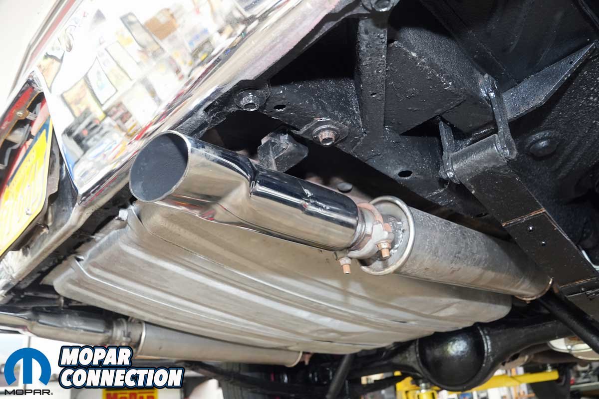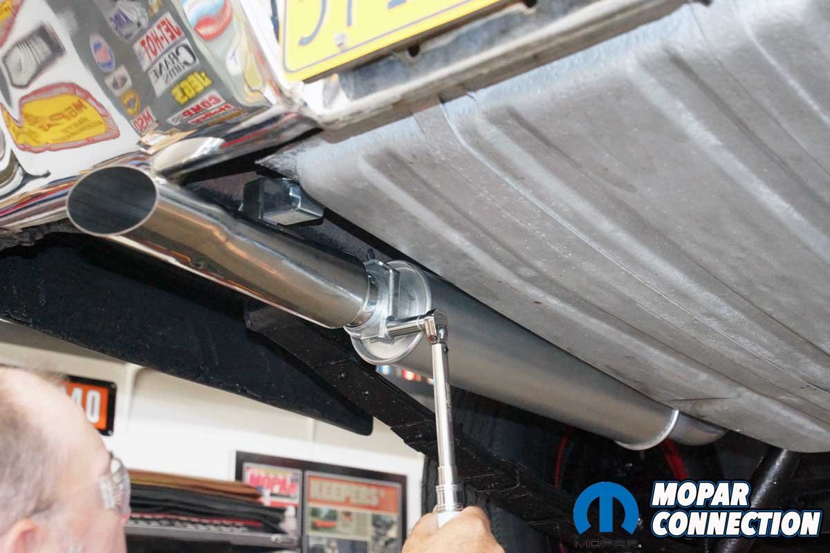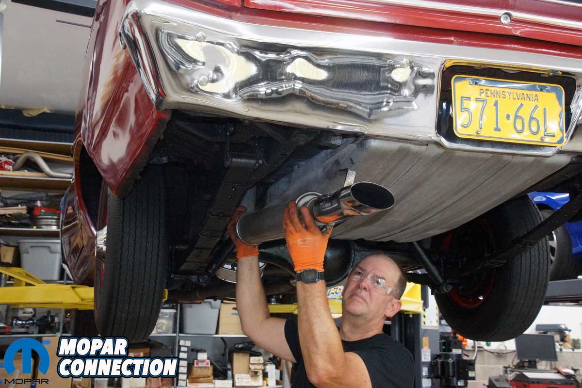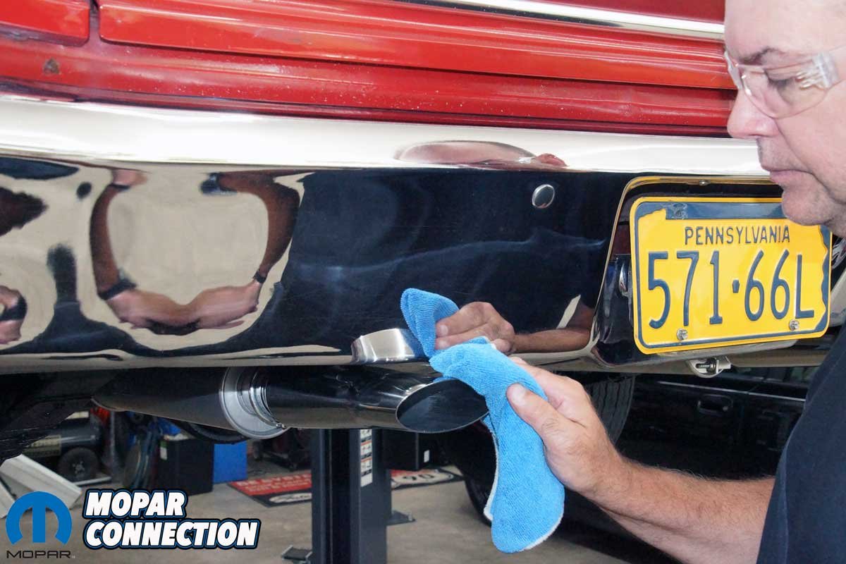 Next came the stainless-steel exhaust tips. We selected Accurate Exhaust’s correct 1968–’70 B-body Hemi tips, which have the right shape, length, and rolled edges to match the originals. The tips slid into the resonator outlets and were secured with the zinc-coated hangers and hardware from the Deluxe kit. We positioned each tip so that it exited at the correct height and angle relative to the rear bumper. Nothing looks worse than crooked exhaust tips on an otherwise perfect restoration.