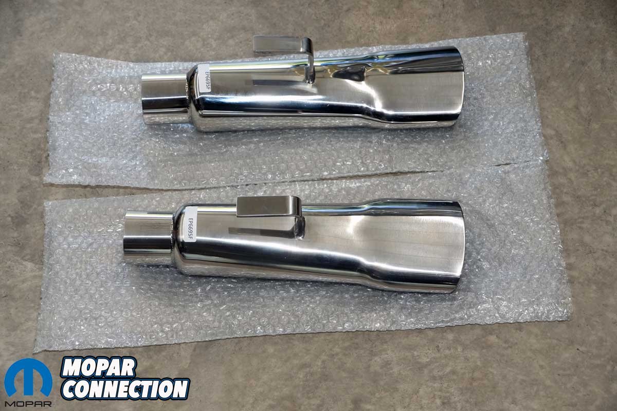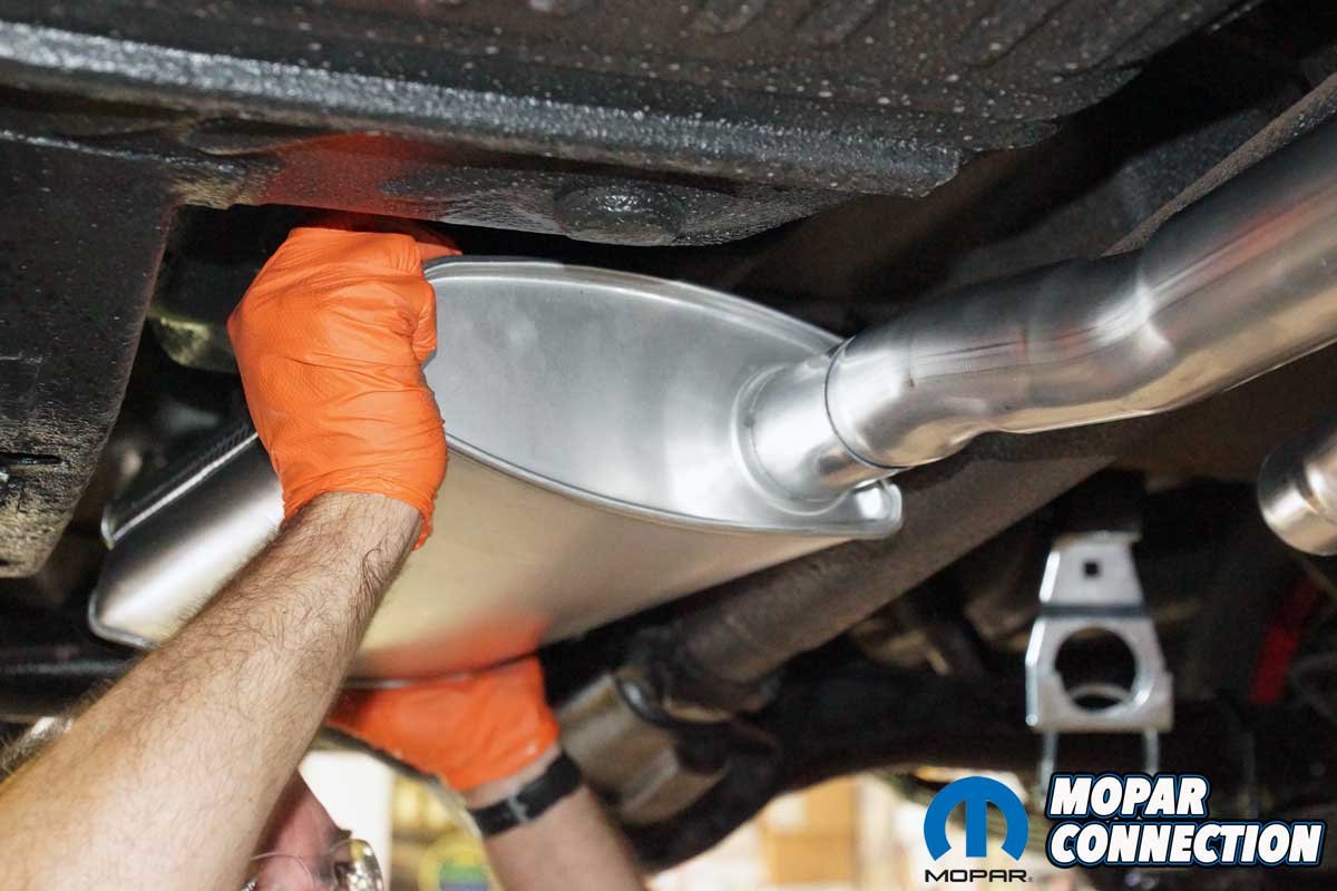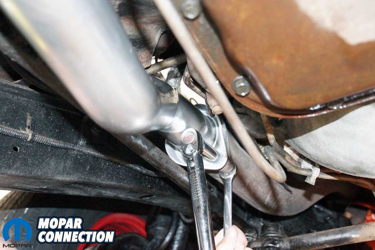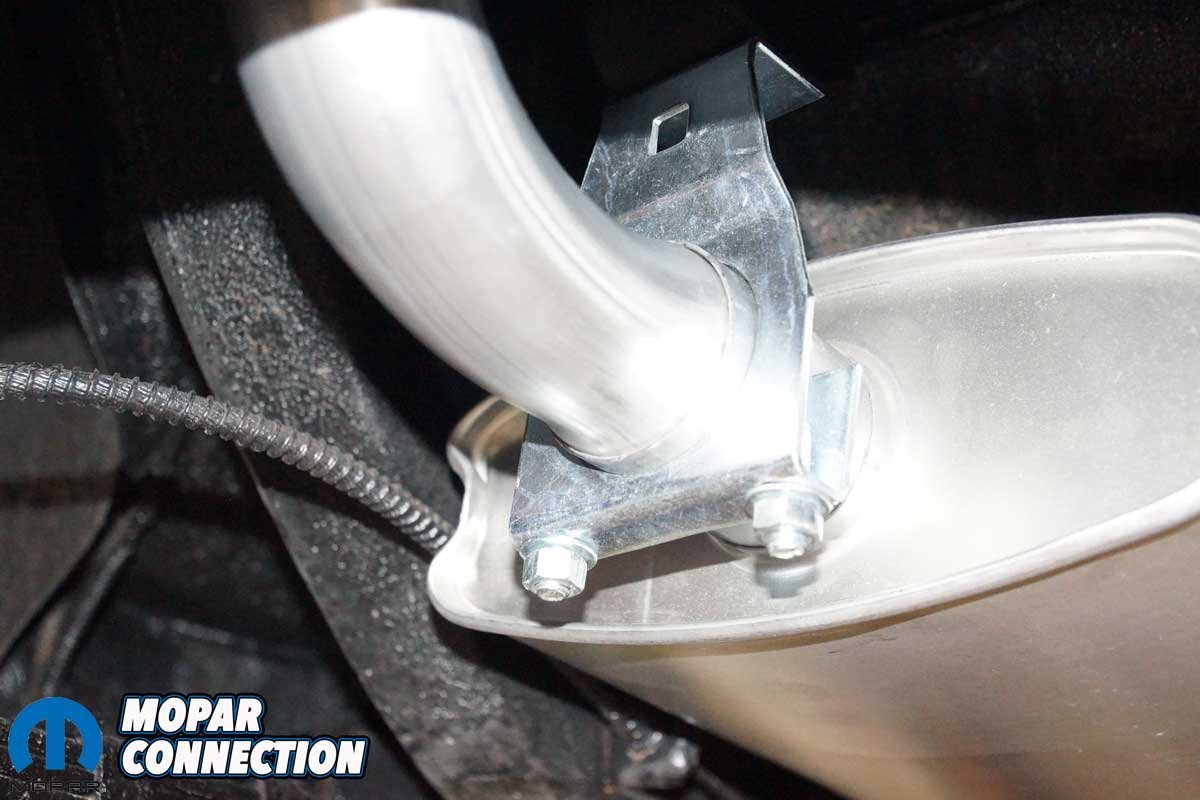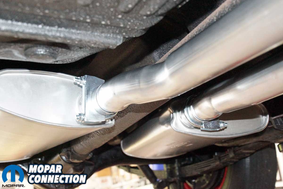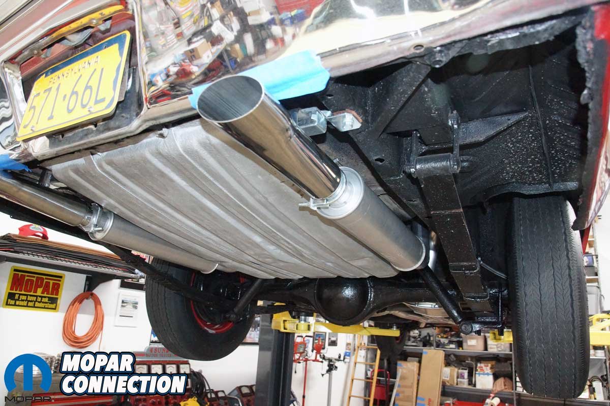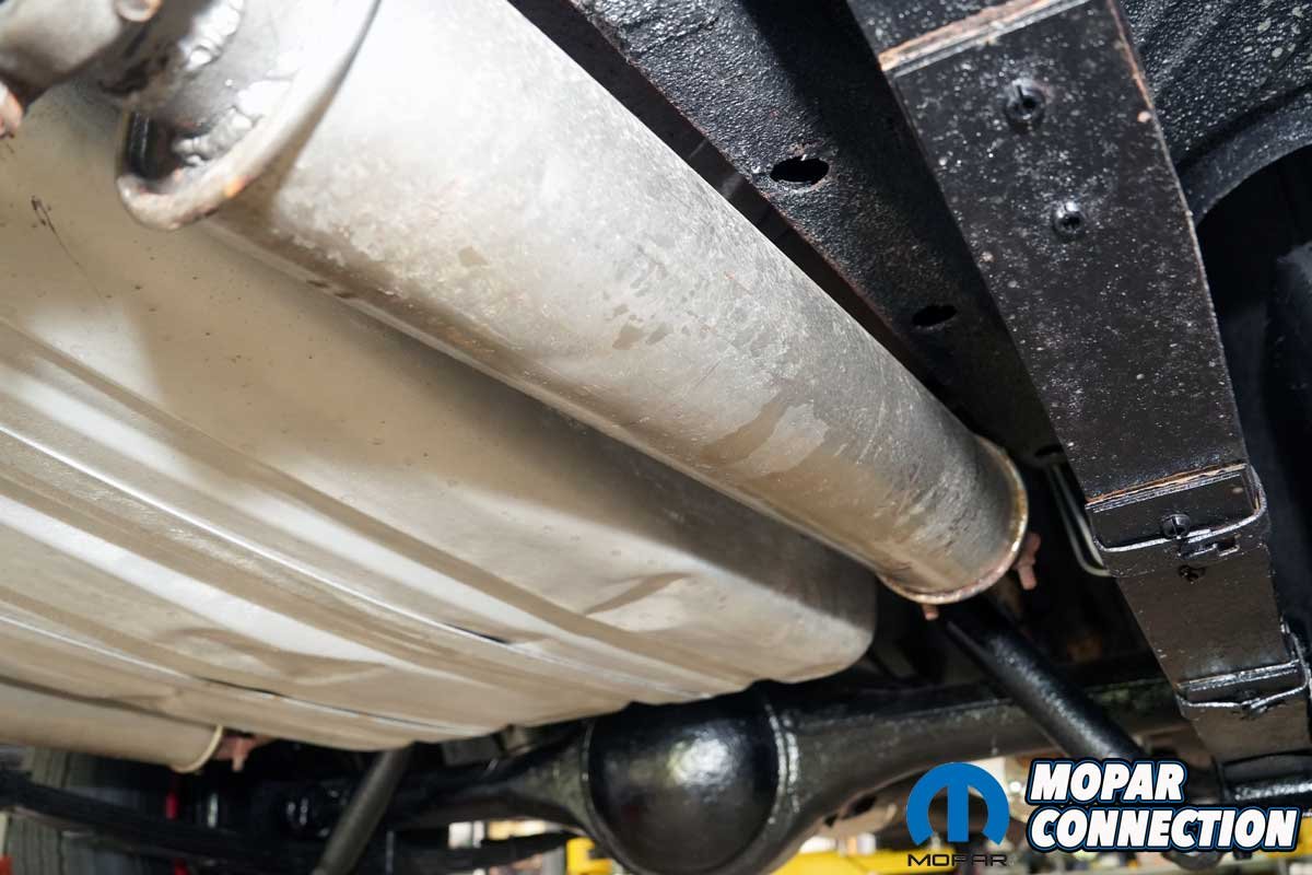 Next came the stainless-steel exhaust tips. We selected Accurate Exhaust’s correct 1968–’70 B-body Hemi tips, which have the right shape, length, and rolled edges to match the originals. The tips slid into the resonator outlets and were secured with the zinc-coated hangers and hardware from the Deluxe kit. We positioned each tip so that it exited at the correct height and angle relative to the rear bumper. Nothing looks worse than crooked exhaust tips on an otherwise perfect restoration.