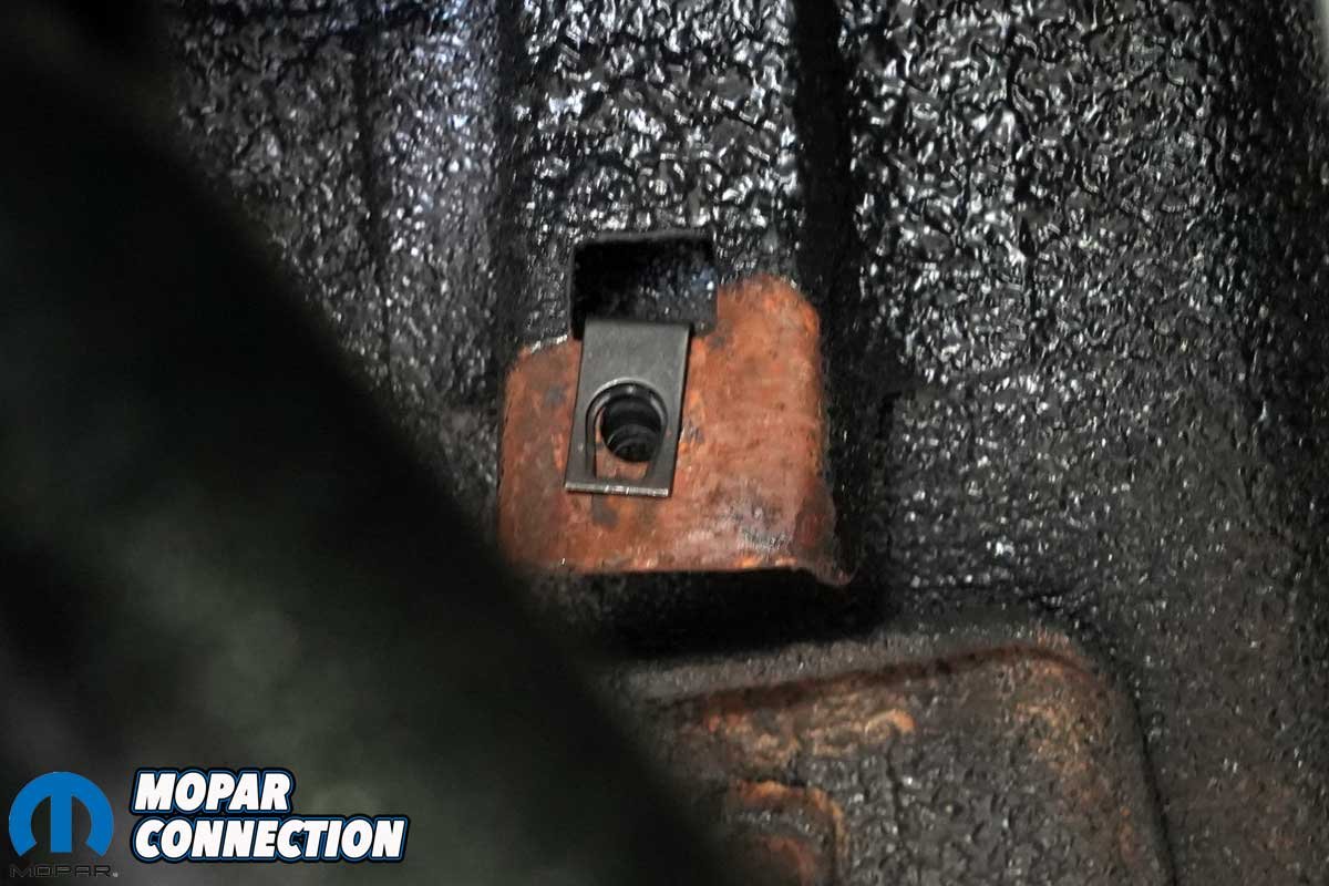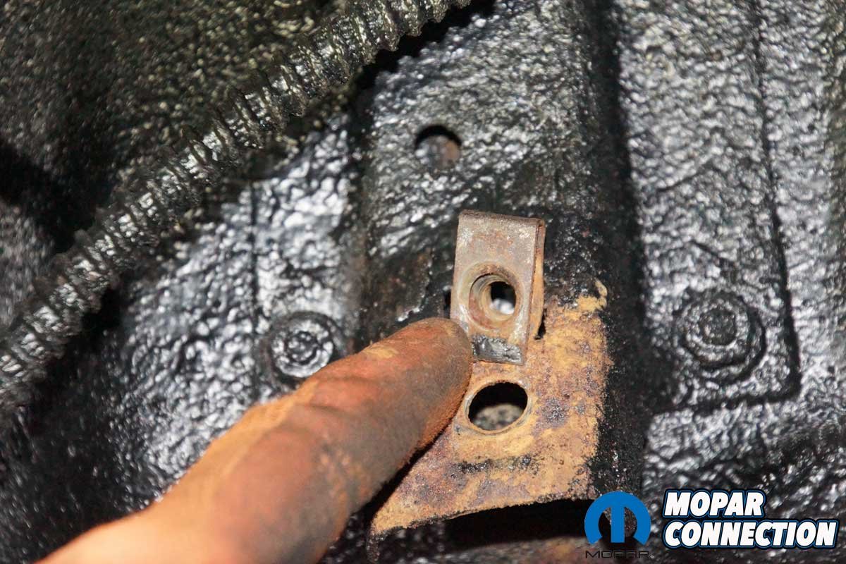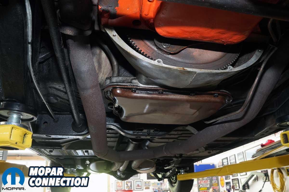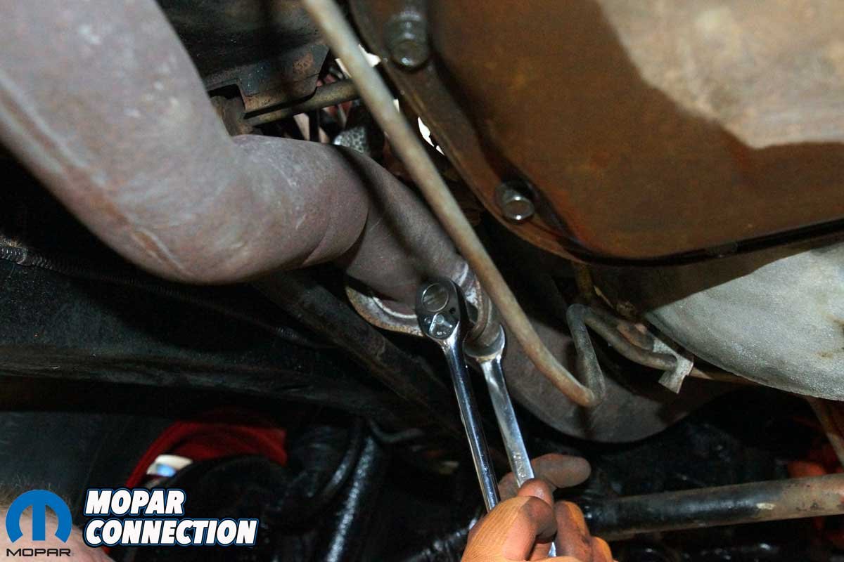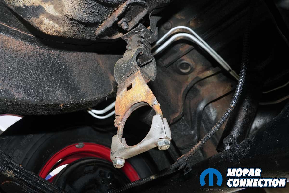The last step was to unbolt the muffler support hangers and detach the exhaust tip brackets. When we swept the floor afterward, the pile of rust was proof that this system was long overdue for replacement. To our surprise, not a single bolt broke, a rare luxury on a 50-plus-year-old B-body.