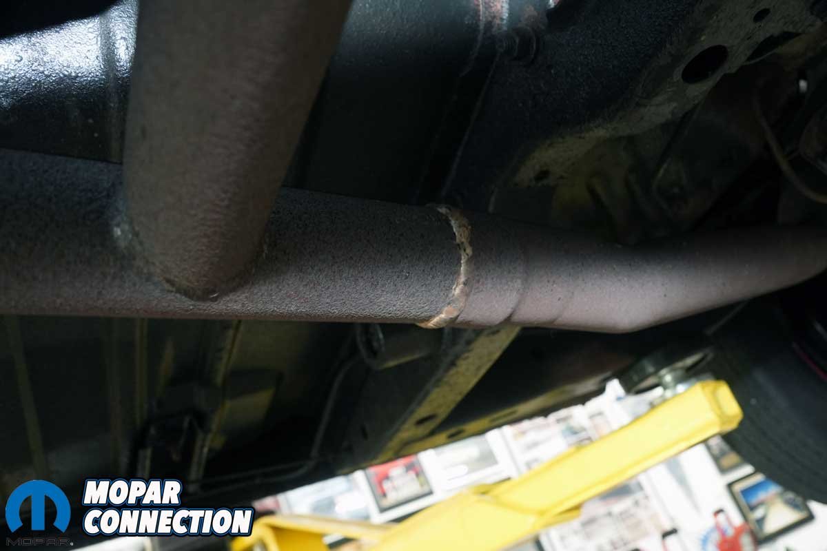 Above Left: The Road Runner’s exhaust was complete but patched together, with the H-pipe appearing to be a mix of original and replacement parts. Above Center: Both header pipes were welded (brazed) to the H-pipe, making it difficult to distinguish original components from replacements. Above Right: The H-pipe sagged noticeably on the passenger side, hanging lower than intended.