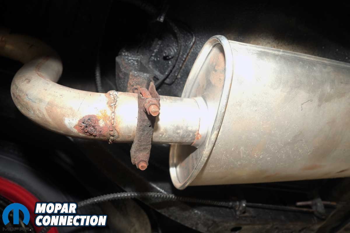 Above: The exhaust tips were original, with flaking chrome and rust replacing the factory finish. The tip brackets remained in good condition, though the driver’s side had been shimmed with several washers to achieve proper, or near proper, bumper clearance.