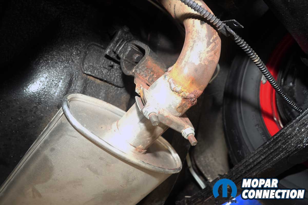 The system was rusty, patched, and missing essential factory features. The passenger-side exhaust manifold and header pipe had their carburetor heat tubes removed and welded shut (a minor detail unless undergoing a concours restoration).