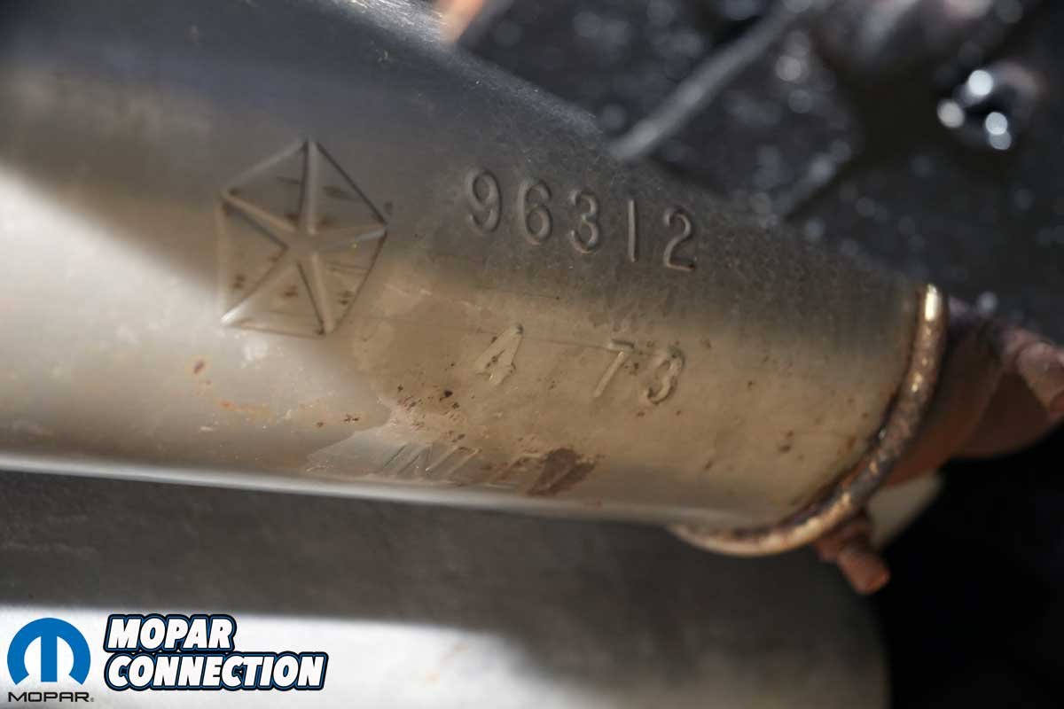 With the system sectioned, we slipped the left exhaust tip from its hanger and carefully rotated the tip, resonator, and over-axle pipe out around the axle housing and shock absorber. The driver’s side came out the same way. Interestingly, both resonators turned out to be replacements from April 1973.