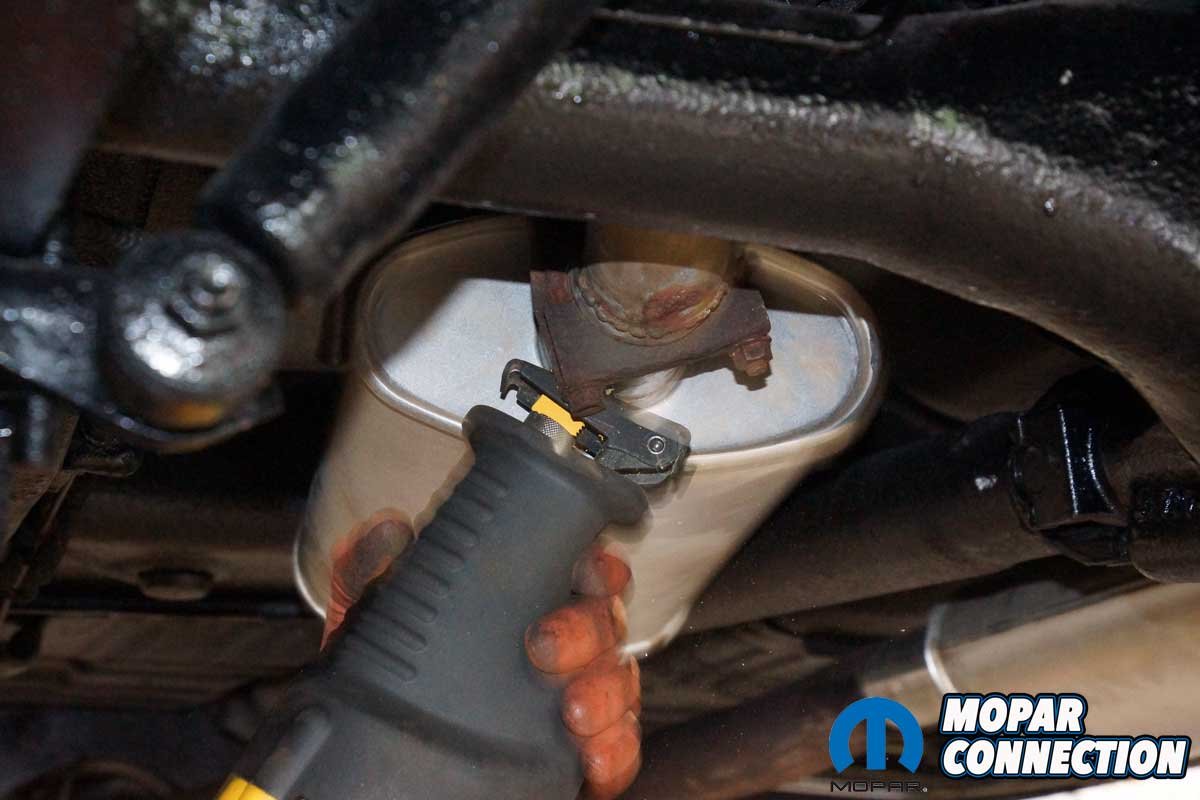 Above Left: To remove the exhaust, we cut the mufflers at the outlet just ahead of the hangers. Above Center: The over-axle section, resonator, and tip were removed as a single unit on both the driver’s and passenger’s sides. Above Right: Two fasteners were removed from each floating flange. Since all the hardware was mismatched, we discarded all four.