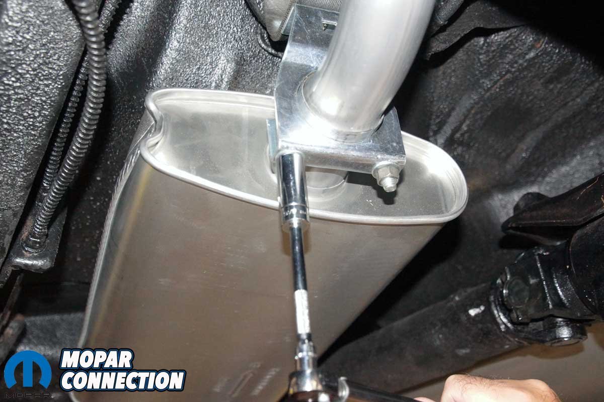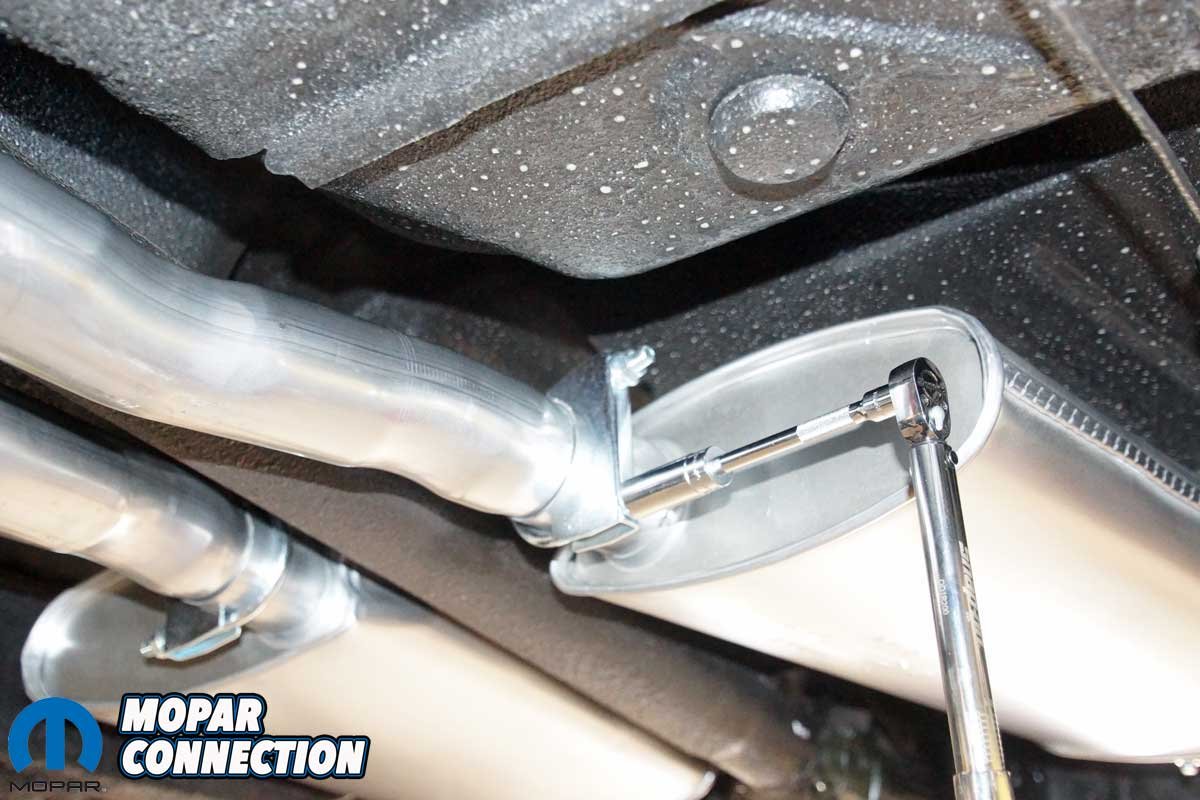 Above Left: With the exhaust clearances set, the exhaust tips were torqued to the resonators at the rear of the Road Runner. Above Right: The rear muffler clamps and hangers were torqued to specification, using the values provided by Accurate Exhaust.